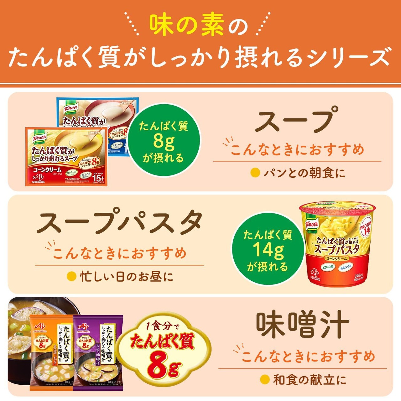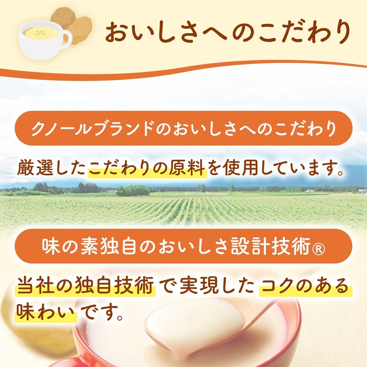 「クノール」の厳選した原料や卓越した開発・製造技術と味の素社の栄養知見を活かした、おいしくて栄養がしっかり摂れるスープです。