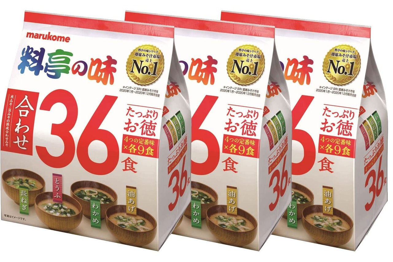 即席みそ汁売上No.1の料亭の味ブランドに、大容量の36食タイプを追加。米みそと豆みその熟成合わせみそに、定番のとうふ、油揚げ、長ねぎ、わかめの具材が各9食入りです。買いだめにもぴったりな大容量タイプで、1人で毎日1食ずつ飲んでも、1カ月以上の商品です。 原材料・成分 調味みそ[米みそ(国内製造)、食塩、砂糖、豆みそ、かつおエキス、昆布エキス、かつお節粉末、宗田かつお節粉末、いわし煮干粉末、かつお節エキス、還元麦芽糖/酒精、調味料(アミノ酸等)、(一部に大豆を含む)] わかめの具[わかめ、ふ、ねぎ、(一部に小麦を含む)] 油あげの具[油あげ、わかめ、ねぎ/凝固剤、(一部に大豆を含む)] 長ねぎの具[ねぎ、わかめ] とうふの具[とうふ、わかめ、ねぎ/凝固剤、(一部に大豆を含む)]