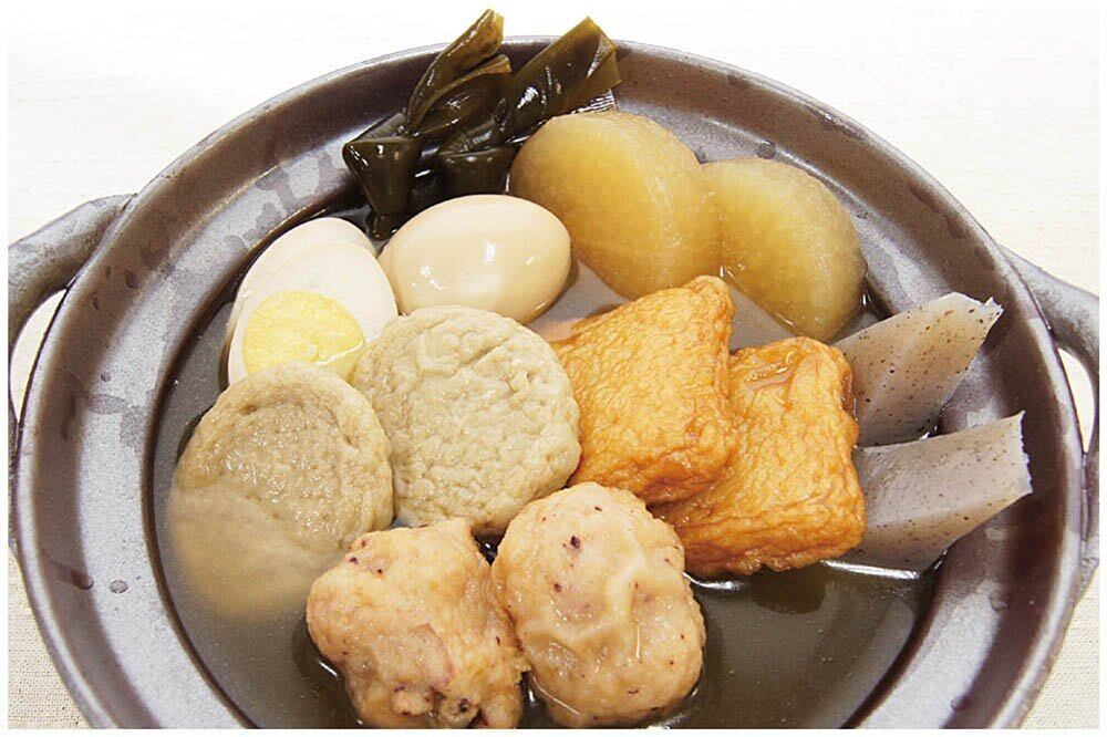 〈練り種〉魚肉練製品(さつま揚、たこ入り揚げかまぼこ、あじ揚げかまぼこ)、おでんつゆ〔食塩、しょうゆ、砂糖、粗砕かつお節、粉砕混合節(さば節、いわし煮干)、こんぶエキス、こんぶ〕、還元水あめ、かきエキス、煮干エキス、ほたてエキス、加工デンプン、調味料(アミノ酸等)、(原材料の一部に小麦、卵、ごまを含む)〈野菜種〉大根、ゆで卵、こんにゃく、おでんつゆ〔食塩、しょうゆ、砂糖、粗砕かつお節、粉砕混合節(さば節、いわし煮干)、こんぶエキス、こんぶ〕、こんぶ、醤油加工品、調味料(アミノ酸等)、水酸化Ca、(原材料の一部に小麦を含む)
