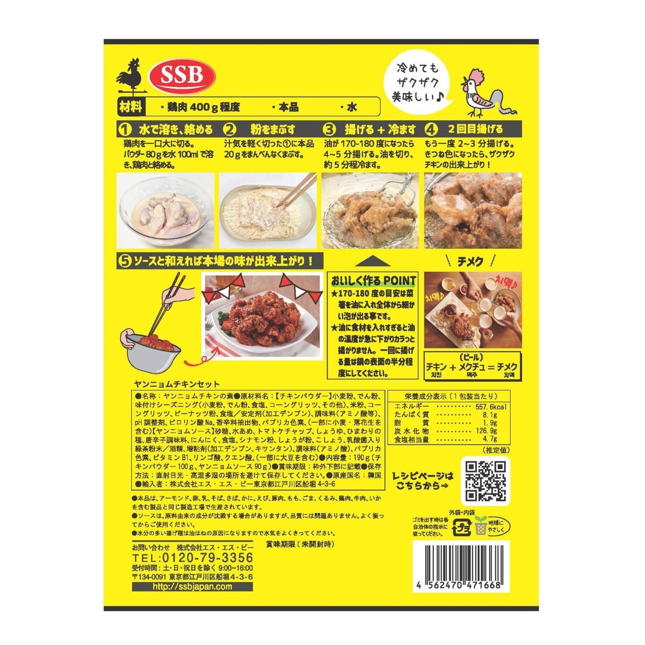 大人気のザクザクチキンパウダーとヤンニョムチキンのソースがセットになっているので簡単・便利です。 お家ですぐに本場の味が楽しめます。ソースはコチュジャンとトマトソースで甘辛く仕上げたスパイシ―なソースです。本場韓国ではフライドチキンとビールやお酒のセットが定番人気で広く親しまれております。