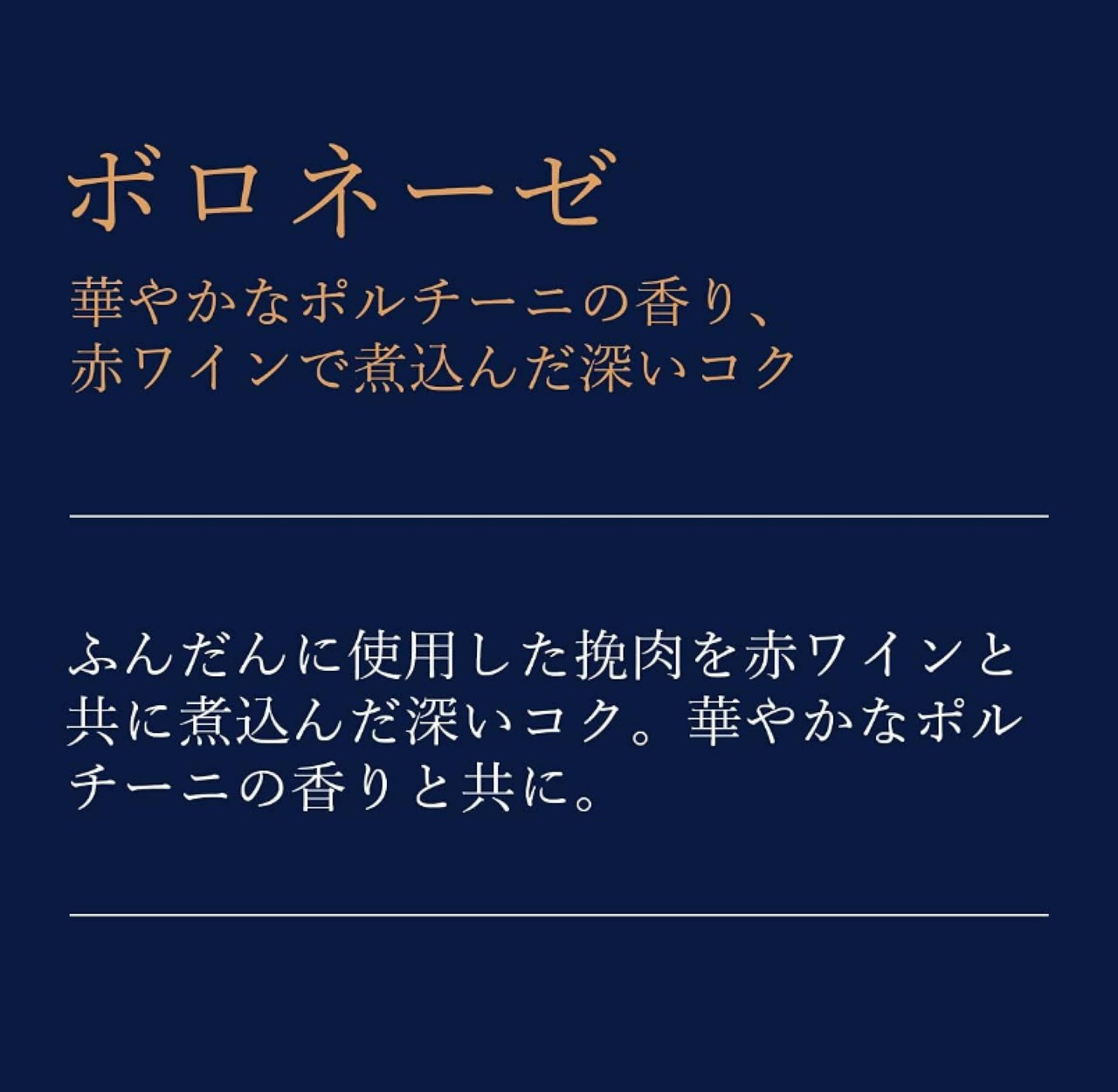 青の洞窟ブランドに新シリーズが登場。その名は「GRAZIA」です。赤ワイン煮込みの挽肉をふんだんに使用。ポルチーニの華やかな香りと共にお楽しみください。お肉の旨みを華やかな香りと共に、贅沢に味わえるボロネーゼ。優雅で贅沢、至福のひとときをお楽しみください。一人前 たっぷりの165gです。