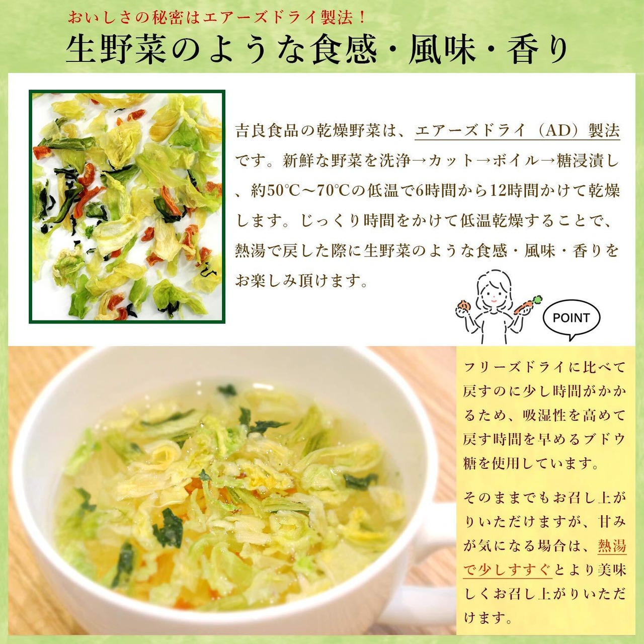 【お湯で戻すだけ!簡単時短調理】乾燥野菜の調理方法は、お湯で戻すだけ。お味噌汁に、スープに、ラーメンに…そのまま入れて美味しくお召し上がりいただけます。「洗わない」「切らない」「余らない」お手軽野菜です。
