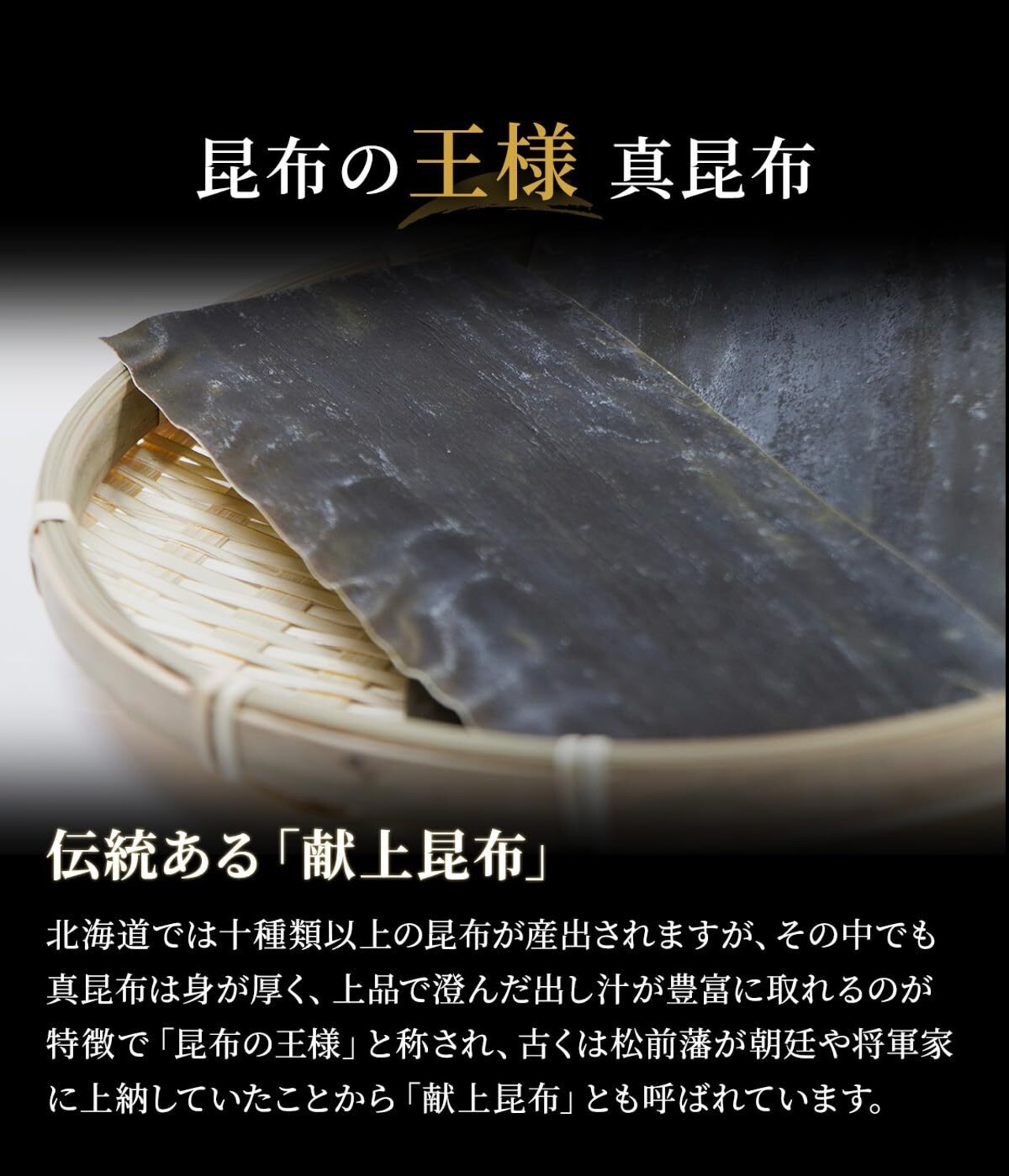 北海道では十種類以上の昆布が産出されますが、その中でも真昆布は身が厚く、上品で澄んだ出し汁が豊富に取れるのが特徴で「昆布の王様」と称され、古くは松前藩が朝廷や将軍家に上納していたことから「献上昆布」とも呼ばれています。
