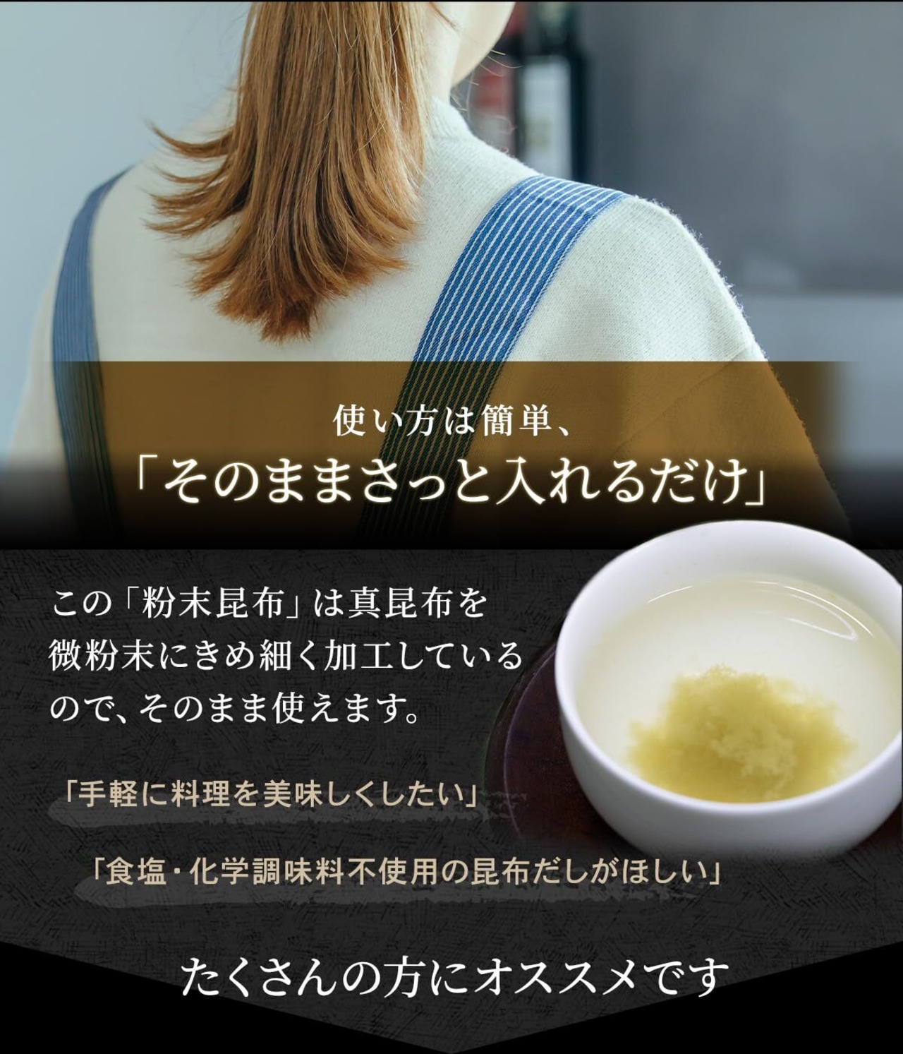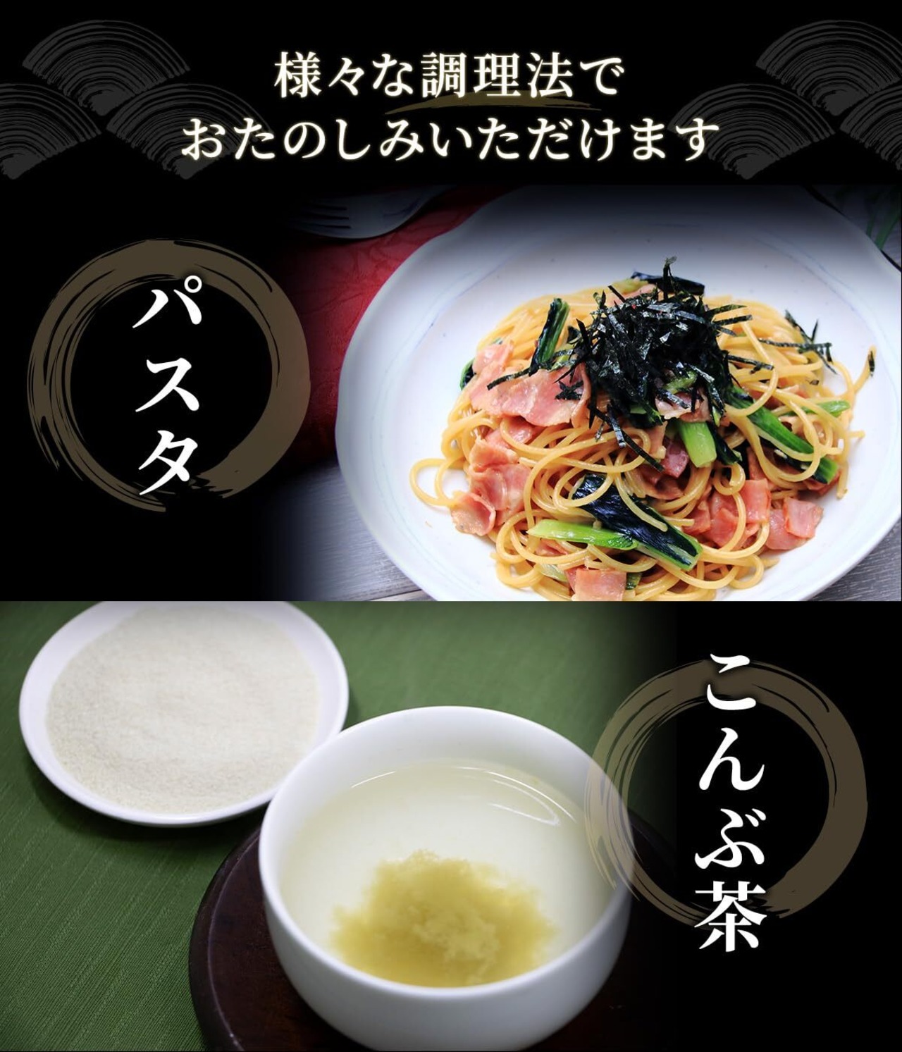 手軽に料理を美味しくしたい、食塩・化学調味料不使用の昆布だしがほしい等たくさんの方にオススメです。 昆布茶、パスタ、漬物、味噌汁など様々な料理にお使い頂けます。
