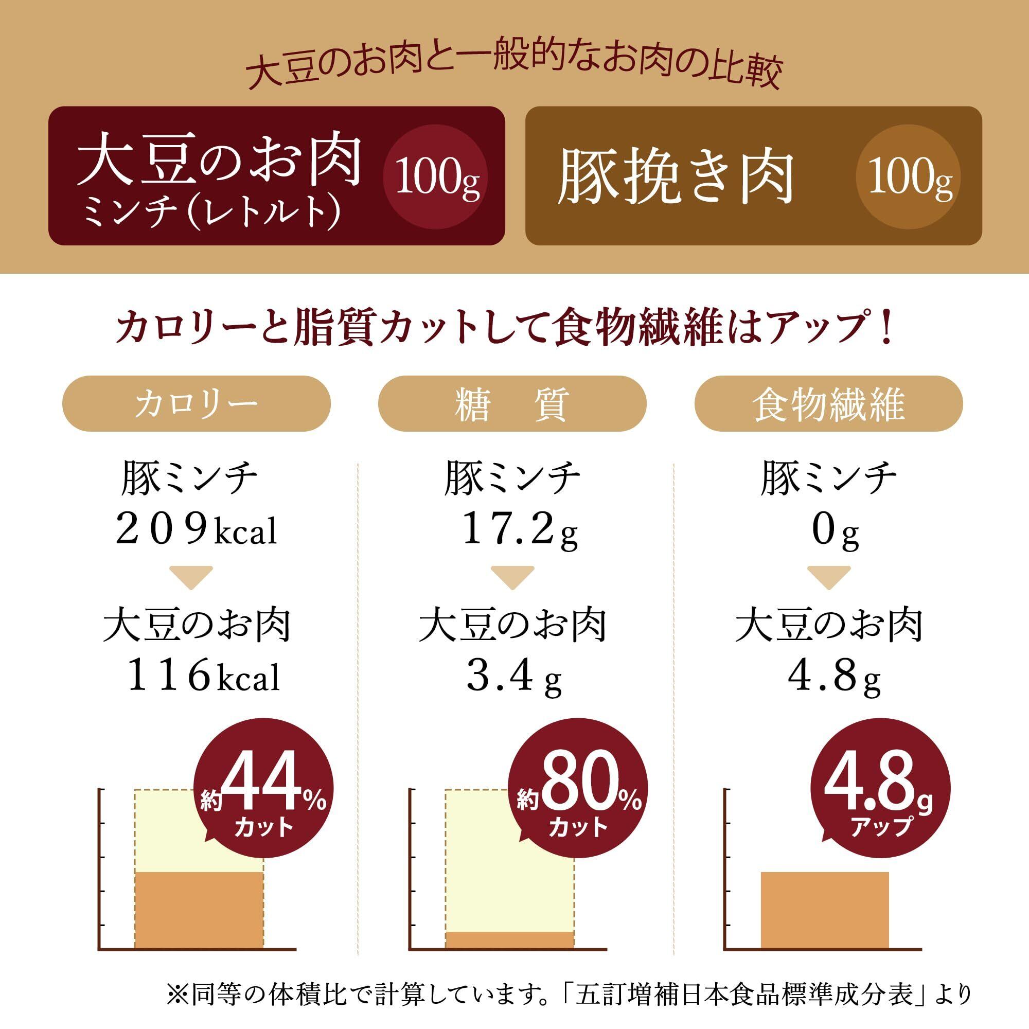 第4のお肉として注目が集まる大豆ミート(ソイミート、ベジミート)。大豆の油分を搾油して加圧加熱・高温乾燥させてできた、お肉の代用品として使える大豆のお肉です。湯戻しや水切りなしでそのまま使えるレトルトタイプです。大豆の栄養を手軽に食べられ、高たんぱくでお肉と比べるとカロリー・コレステロールが低く、低脂質。動物性原料不使用で、麻婆豆腐やハンバーグ、ミートソース等、様々な料理に使えます。