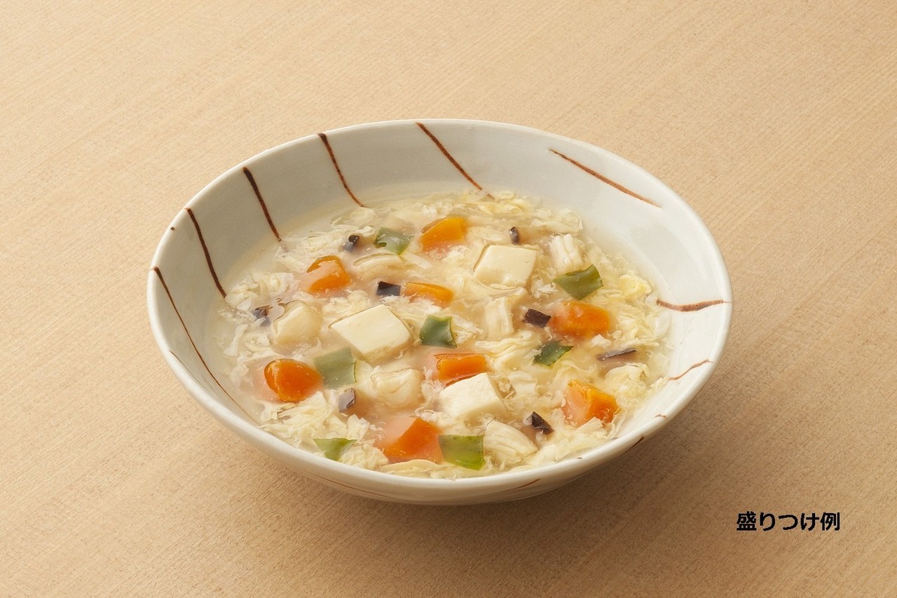 貝柱、にんじん、豆腐、しいたけをかつおと昆布をきかせただしで煮込み、上品なかきたまあんで彩りよく仕上げました。