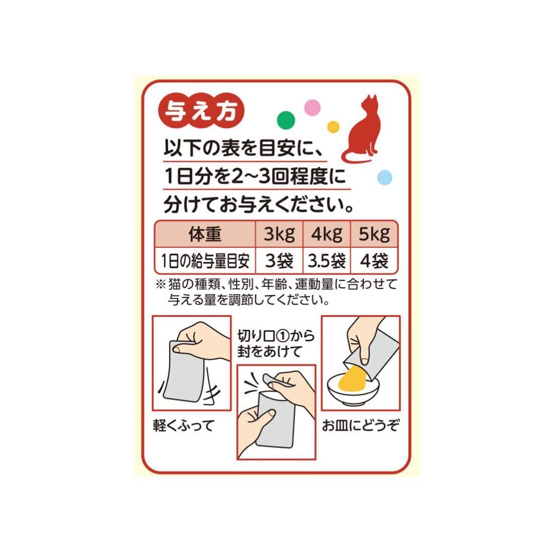 【原材料】 肉類(鶏肉、牛レバー、チキンエキス)、小麦たんぱく、エンドウたんぱく、油脂類(ひまわり油、鶏脂)、魚介類(ツナエキス、サーモン)、調味料、増粘多糖類、ミネラル類(Ca、P、K、Na、Cl、Mg、Fe、Cu、Mn、Zn、I、Se)、ポリリン酸Na、キシロース、ビタミン類(A、D、E、K、B1、B2、B6、B12、ナイアシン、パントテン酸、葉酸、ビオチン、コリン)、タウリン、香料 【成分】 たんぱく質9.7%以上、脂質2.1%以上、粗繊維0.1%以下、灰分3.8%以下、水分84.4%以下 【エネルギー】 43kcal/1袋(60g)