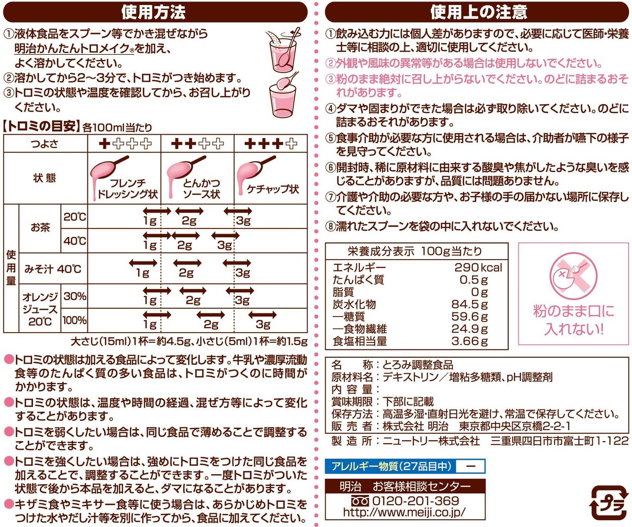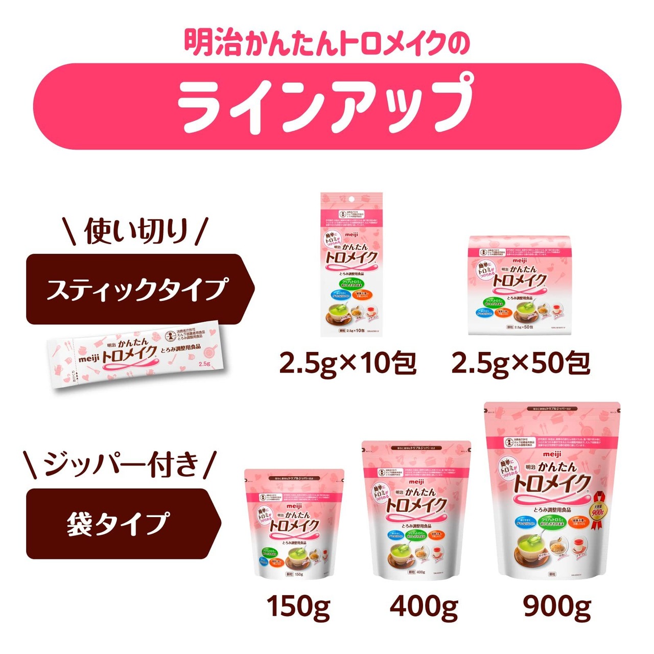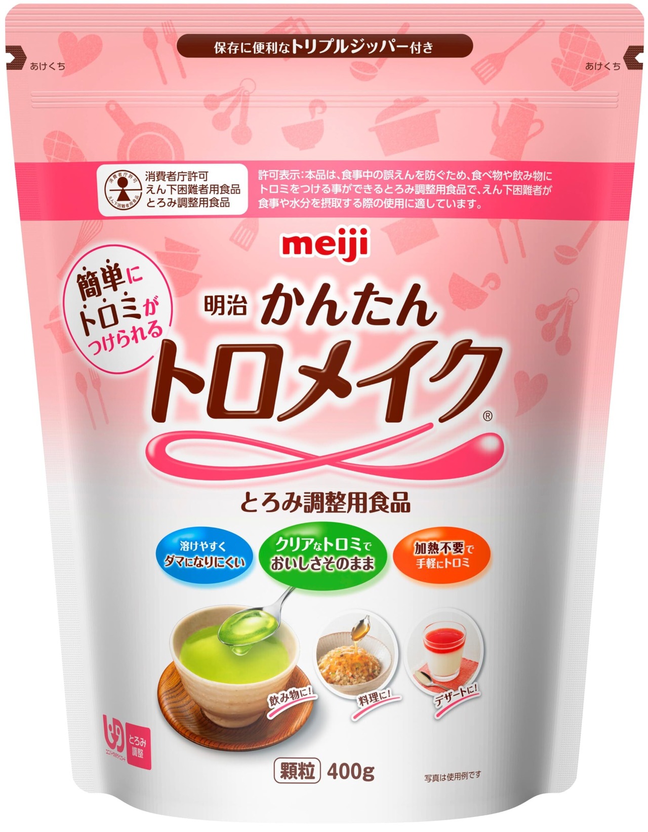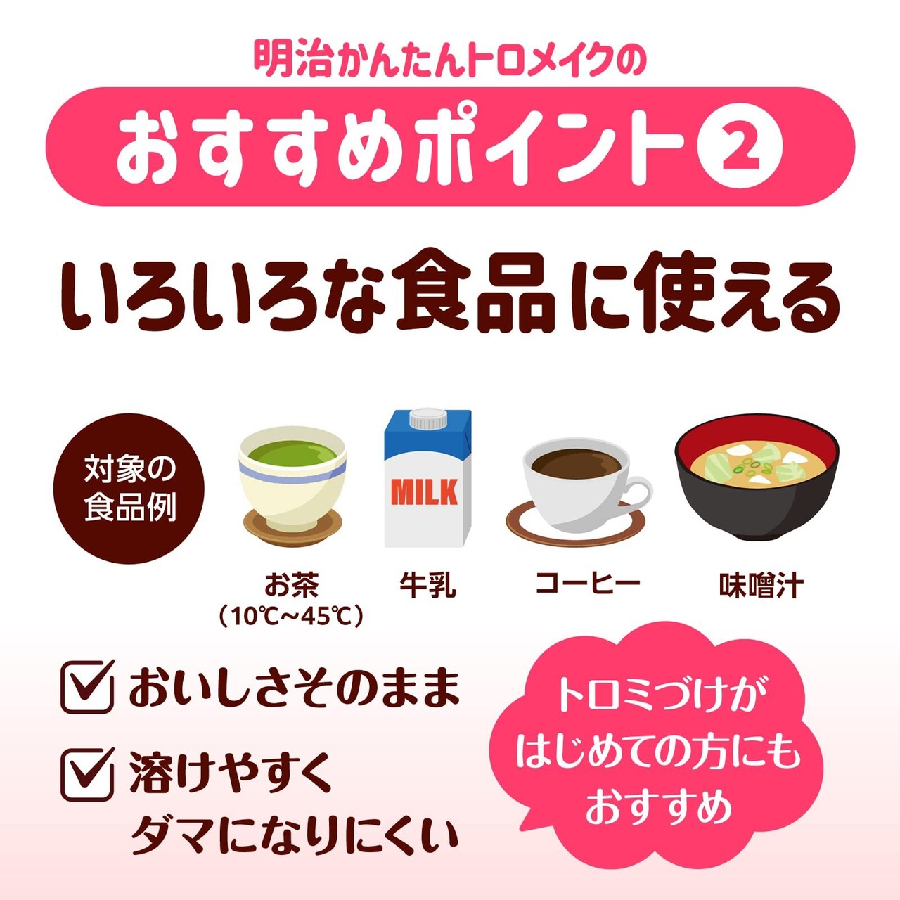明治かんたんトロメイクは、食品本来の「味・色・香り」をそこなわず、おいしさそのまま、誰でも簡単にすばやく溶かすことができる「とろみ調整食品」です。分包タイプから900gの大容量サイズまで、ラインナップが充実してます。