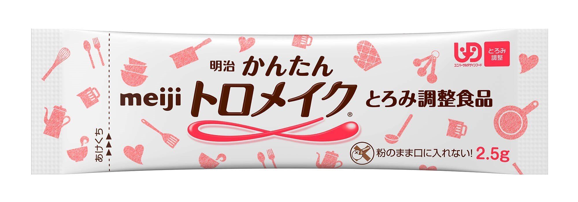 明治おうちで簡単トロメイクは、食品本来の「味・色・香り」をそこなわず、おいしさそのまま、誰でも簡単にすばやく溶かすことができる「とろみ調整食品」です。