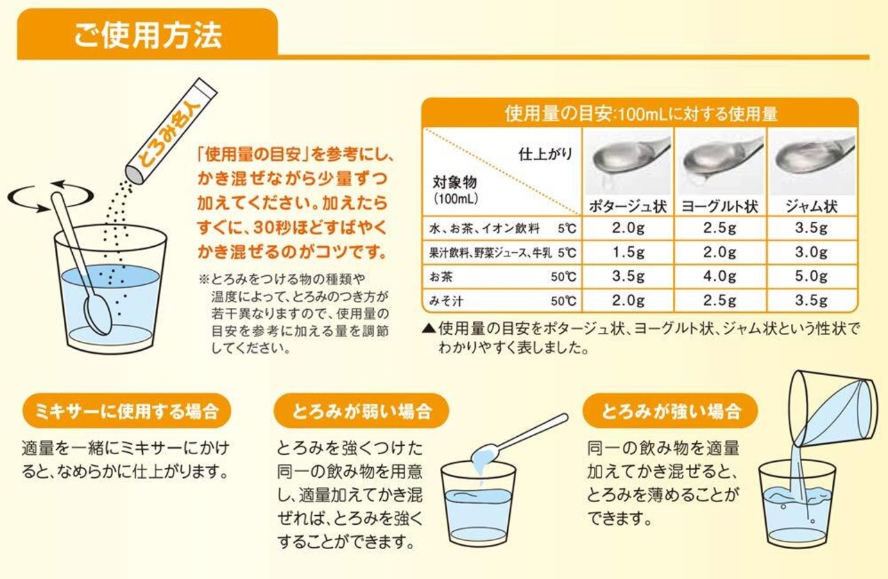 食べ物・飲み物に、少しずつ混ぜながら加えてください。加えたら30秒ほどすばやくかき混ぜてください。(通常、加えてから1-2分でとろみがつき始めますが、加える食品の種類や温度によって若干時間がかかることがあります。)