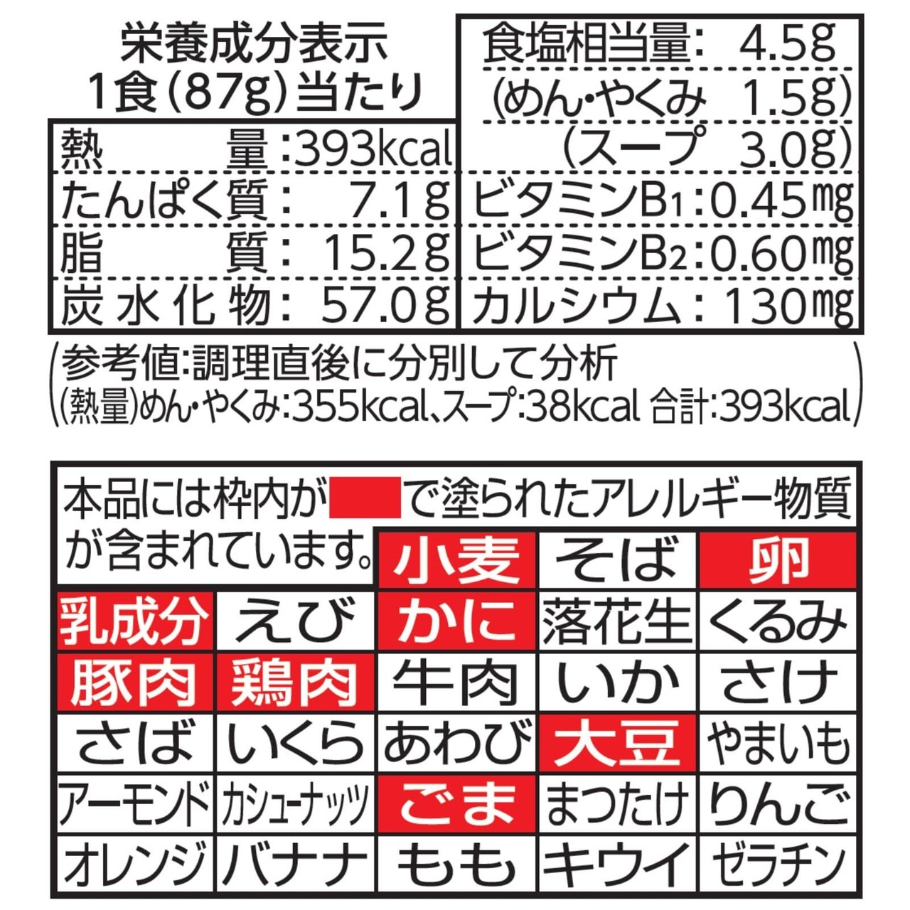 原材料: 油揚げめん(小麦粉(国内製造)、植物油脂、食塩、しょうゆ)、スープ(食塩、鶏脂、ポーク調味油、ほたて調味料、糖類、ポーク調味料、豚脂、ごま、香辛料、オニオンパウダー、チキン調味料、たん白加水分解物、植物油脂)/加工でん粉、調味料(アミノ酸等)、炭酸Ca、かんすい、香料、乳化剤、カロチノイド色素、酸味料、香辛料抽出物、酸化防止剤(ビタミンE)、ビタミンB2、カラメル色素、ビタミンB1、(一部にかに・小麦・卵・乳成分・ごま・大豆・鶏肉・豚肉を含む)