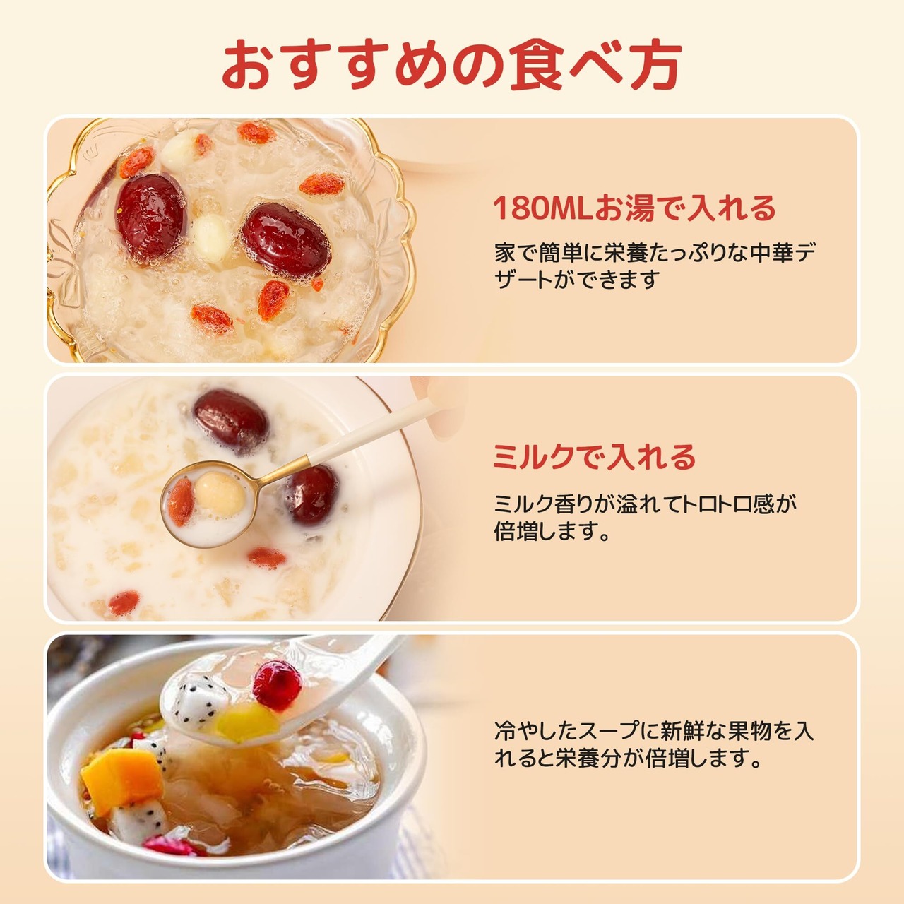 【おすすめの食べ方】180mlお湯で入れます。家で簡単に栄養たっぷりな中華 薬膳スープができます。ミルクで入れますと、ミルク香りが溢れ、とろとろ感が倍増します。冷やした中国 スープに新鮮な果物を入れると栄養分が倍増します。