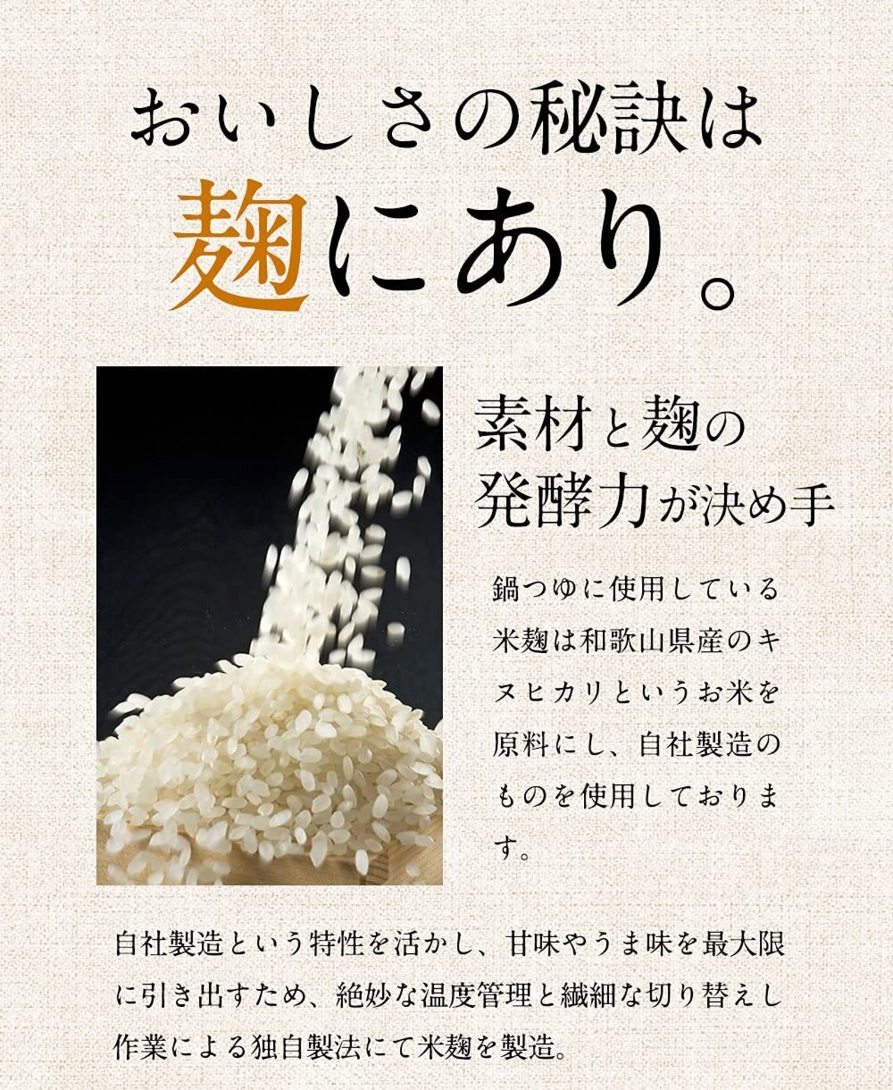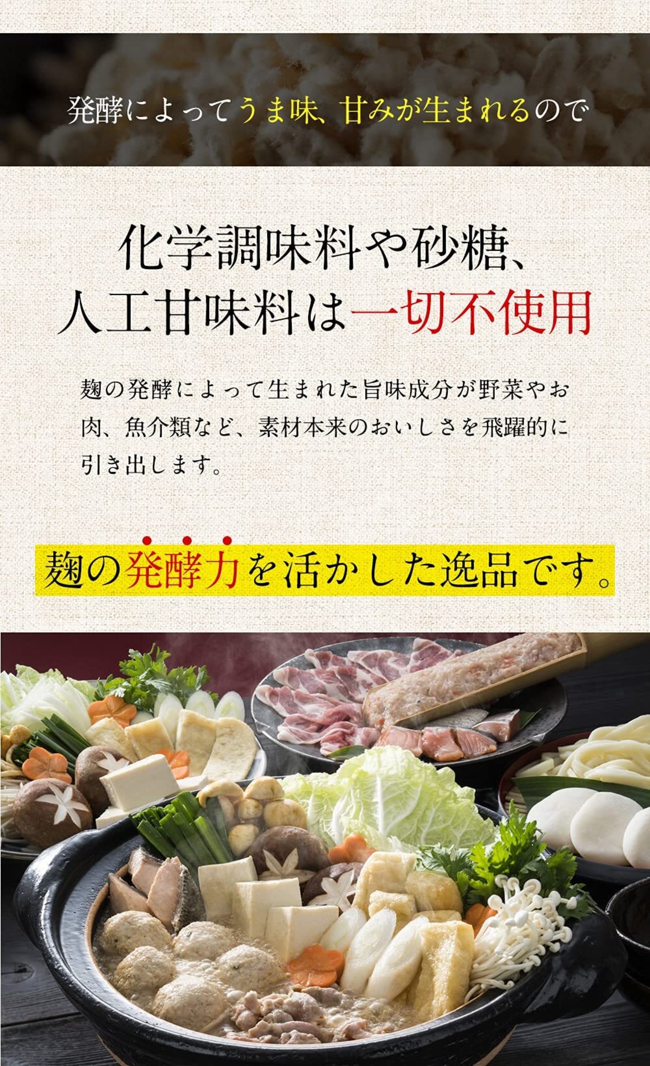 【美味しくてヘルシーな「麹の鍋つゆ」】麹だしが味わい深い逸品、麹の発酵力で鍋の具材がさらに美味しく!〆まで美味しい鍋つゆの素です。