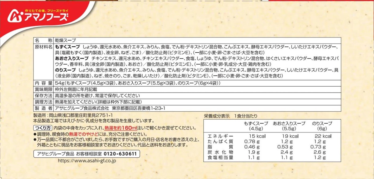 原材料:もずく:しょうゆ、還元水あめ、魚介エキス、みりん、食塩、でん粉・デキストリン混合物、こんぶエキス、酵母エキスパウダー、しいたけエキスパウダー、具(塩蔵もずく(国内製造)、液全卵、ねぎ、ごま)/酸化防止剤(ビタミンE)、(一部に小麦・卵・ごま・さば・大豆を含む) あおさ:チキンエキス、還元水あめ、チキンエキスパウダー、食塩、しょうゆ、でん粉・デキストリン混合物、はくさいエキスパウダー、酵母エキスパウダー、香辛料、具(液全卵(国内製造)、あおさ)/酸化防止剤(ビタミンE)、(一部に小麦・卵・乳成分・大豆・鶏肉を含む) のり:しょうゆ、還元水あめ、魚介エキス、みりん、食塩、でん粉・デキストリン混合物、こんぶエキス、酵母エキスパウダー、しいたけエキスパウダー、具(液全卵(国内製造)、ねぎ、焼きのり、ごま、乾燥しいたけ)/酸化防止剤(ビタミンE)、(一部に小麦・卵・ごま・さば・大豆を含む)
