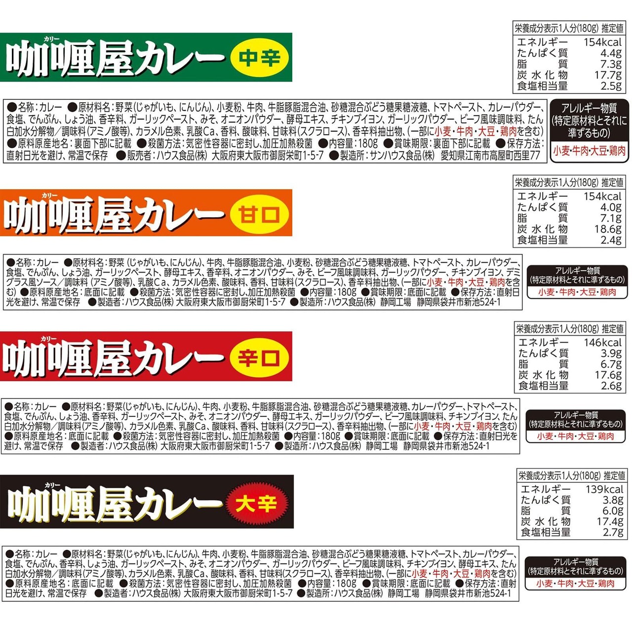 【甘口】野菜(じゃがいも、にんじん)、牛肉、牛脂豚脂混合油、小麦粉、砂糖混合ぶどう糖果糖液糖、トマトペースト、カレーパウダー、食塩、でんぷん、しょう油、ガーリックペースト、酵母エキス、香辛料、オニオンパウダー、みそ、ビーフ風味調味料、ガーリックパウダー、チキンブイヨン、デミグラス風ソース/調味料(アミノ酸等)、乳酸Ca、カラメル色素、酸味料、香料、甘味料(スクラロース)、香辛料抽出物、(一部に小麦・牛肉・大豆・鶏肉を含む) 【中辛】野菜(じゃがいも、にんじん)、小麦粉、牛肉、牛脂豚脂混合油、砂糖混合ぶどう糖果糖液糖、トマトペースト、カレーパウダー、食塩、でんぷん、しょう油、香辛料、ガーリックペースト、みそ、オニオンパウダー、酵母エキス、チキンブイヨン、ガーリックパウダー、ビーフ風味調味料、たん白加水分解物/調味料(アミノ酸等)、カラメル色素、乳酸Ca、香料、酸味料、甘味料(スクラロース)、香辛料抽出物、(一部に小麦・牛肉・大豆・鶏肉を含む) 【辛口】野菜(じゃがいも、にんじん)、牛肉、小麦粉、牛脂豚脂混合油、砂糖混合ぶどう糖果糖液糖、カレーパウダー、トマトペースト、食塩、でんぷん、しょう油、香辛料、ガーリックペースト、みそ、オニオンパウダー、酵母エキス、ガーリックパウダー、ビーフ風味調味料、チキンブイヨン、たん白加水分解物/調味料(アミノ酸等)、カラメル色素、乳酸Ca、酸味料、香料、甘味料(スクラロース)、香辛料抽出物、(一部に小麦・牛肉・大豆・鶏肉を含む) 【大辛】野菜(じゃがいも、にんじん)、牛肉、小麦粉、牛脂豚脂混合油、砂糖混合ぶどう糖果糖液糖、トマトペースト、カレーパウダー、食塩、でんぷん、香辛料、しょう油、ガーリックペースト、みそ、オニオンパウダー、ガーリックパウダー、ビーフ風味調味料、チキンブイヨン、酵母エキス、たん白加水分解物/調味料(アミノ酸等)、カラメル色素、乳酸Ca、酸味料、香料、甘味料(スクラロース)、香辛料抽出物、(一部に小麦・牛肉・大豆・鶏肉を含む) 【ポーク】野菜(じゃがいも、にんじん)、豚肉、砂糖混合ぶどう糖果糖液糖、小麦粉、パーム油、カレーパウダー、トマトペースト、食塩、でんぷん、しょう油、オニオンパウダー、酵母エキス、香辛料、ガーリックペースト、みそ、ガーリックパウダー、チキンブイヨン/調味料(アミノ酸等)、乳酸Ca、カラメル色素、香料、酸味料、甘味料(スクラロース)、(一部に小麦・大豆・鶏肉・豚肉を含む) 【チキン】野菜(じゃがいも、にんじん)、鶏肉、砂糖混合ぶどう糖果糖液糖、小麦粉、パーム油、トマトペースト、カレーパウダー、食塩、でんぷん、酵母エキス、しょう油、香辛料、オニオンパウダー、ガーリックペースト、みそ、ガーリックパウダー、チキンブイヨン/調味料(アミノ酸等)、乳酸Ca、カラメル色素、香料、香辛料抽出物、酸味料、(一部に小麦・大豆・鶏肉を含む) 【コクデミ】野菜(じゃがいも、にんじん)、鶏肉、砂糖混合ぶどう糖果糖液糖、小麦粉、パーム油、トマトペースト、カレーパウダー、食塩、でんぷん、酵母エキス、しょう油、香辛料、オニオンパウダー、ガーリックペースト、みそ、ガーリックパウダー、チキンブイヨン/調味料(アミノ酸等)、乳酸Ca、カラメル色素、香料、香辛料抽出物、酸味料、(一部に小麦・大豆・鶏肉を含む) 【キーマ】鶏肉、牛脂豚脂混合油、小麦粉、粒状植物性たん白、トマトペースト、砂糖混合ぶどう糖果糖液糖、しょうが、カレーパウダー、食塩、乾燥玉ねぎ、カルダモン、ガーリックペースト、クミン、しょう油、でんぷん、ビーフ風味調味料、ターメリック、オニオンパウダー、チキンブイヨン、ガーリックパウダー、焙煎フェヌグリーク、クローブ、唐がらし、ブラックペパー、フェヌグリークリーフ/調味料(アミノ酸等)、カラメル色素、酸味料、香料、甘味料(スクラロース)、(一部に小麦・大豆・鶏肉を含む)