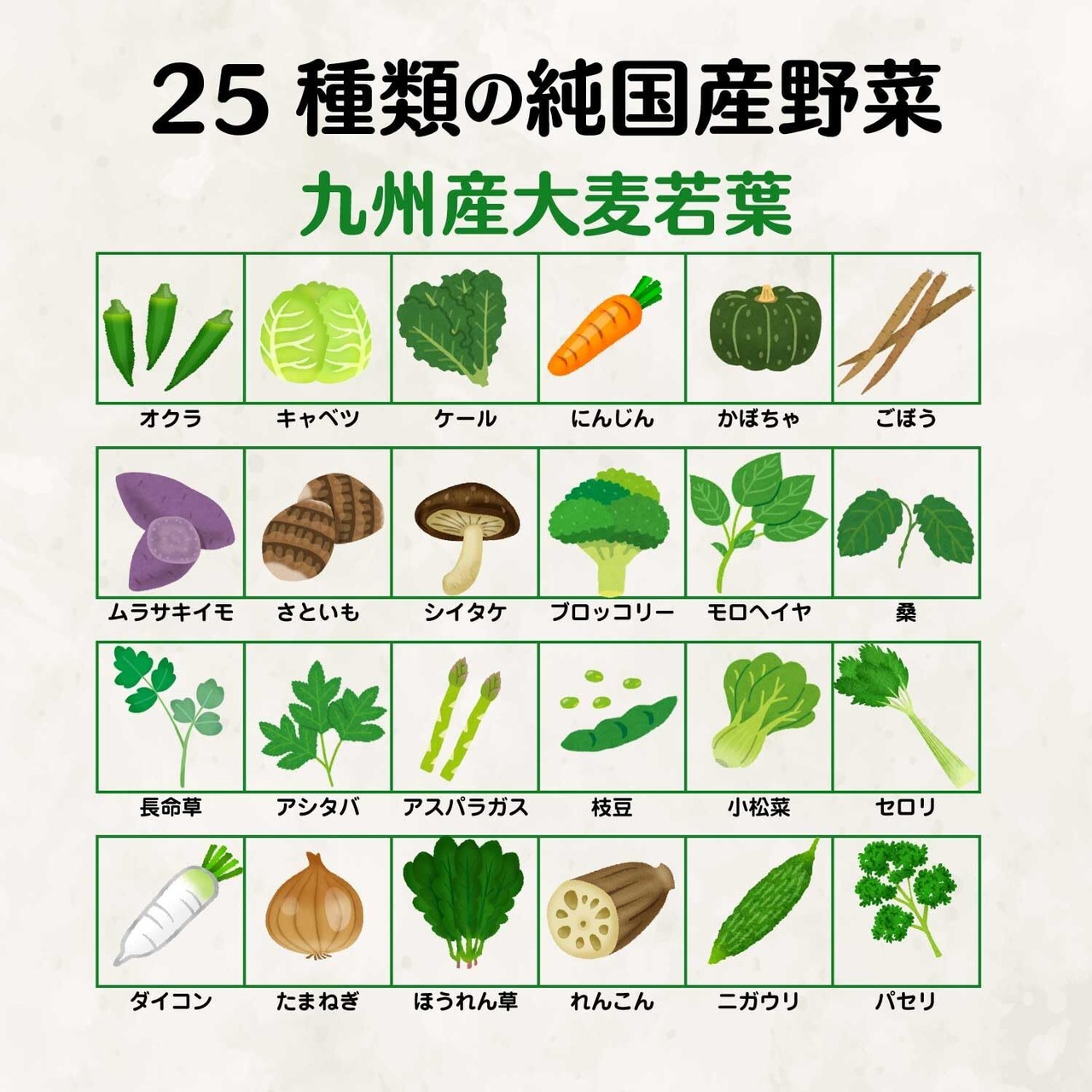 【25種類の野菜を一杯で摂取】キャベツ・ケール・ニンジン・カボチャ・レモン等、25種類もの野菜が凝縮されています。その全てが安心・安全の純国産です。野菜不足改善に、毎日の食事にプラスしてみてはいかがでしょうか。