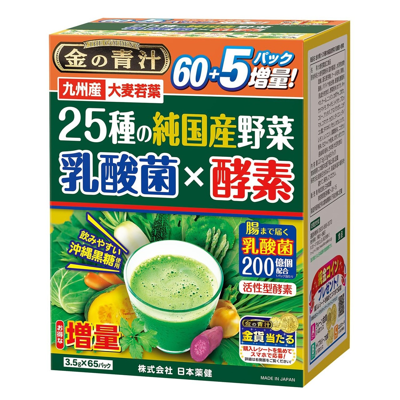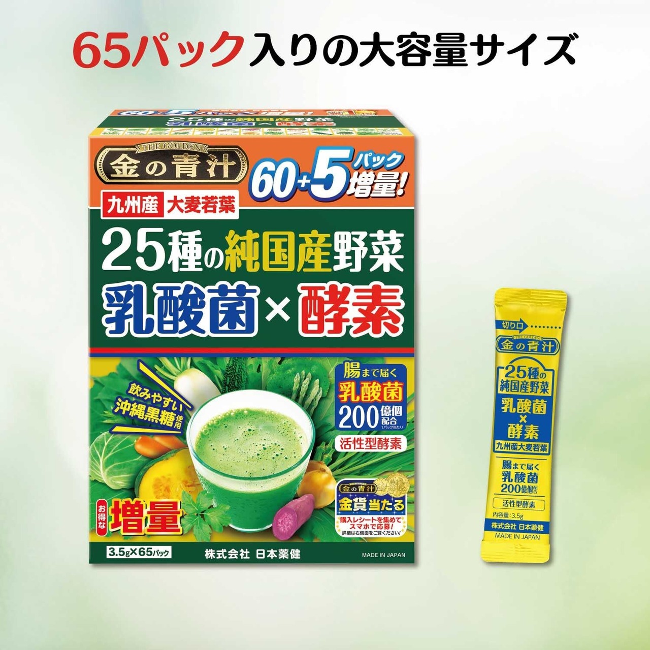 NIHON YAKKEN 金の青汁 (R) 25種の純国産野菜 乳酸菌 × 酵素 (65パック / 沖縄黒糖使用) 酵素青汁 純国産大麦若葉 (青パパイヤ 酵素/食物繊維) 農薬不使用 野菜不足 改善 (日本薬健)