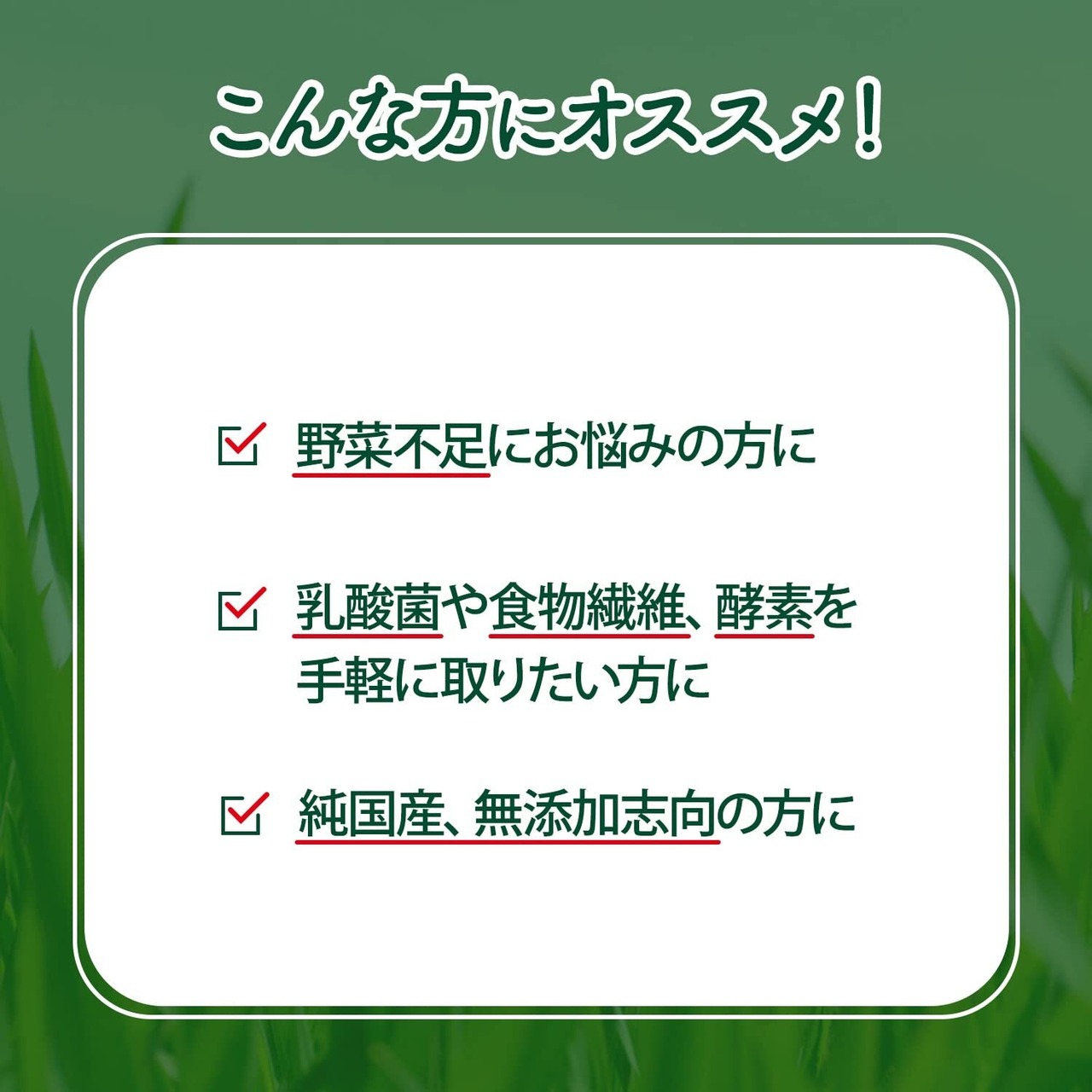【こんな方におすすめ】野菜不足にお悩みの方、乳酸菌や食物繊維・酵素を手軽に取りたい方、純国産・無添加にこだわる方におすすめです。沖縄県産黒糖で美味しく自然な甘さがあり、青汁の苦みが気になる方でもストレスなく飲み続けられます。