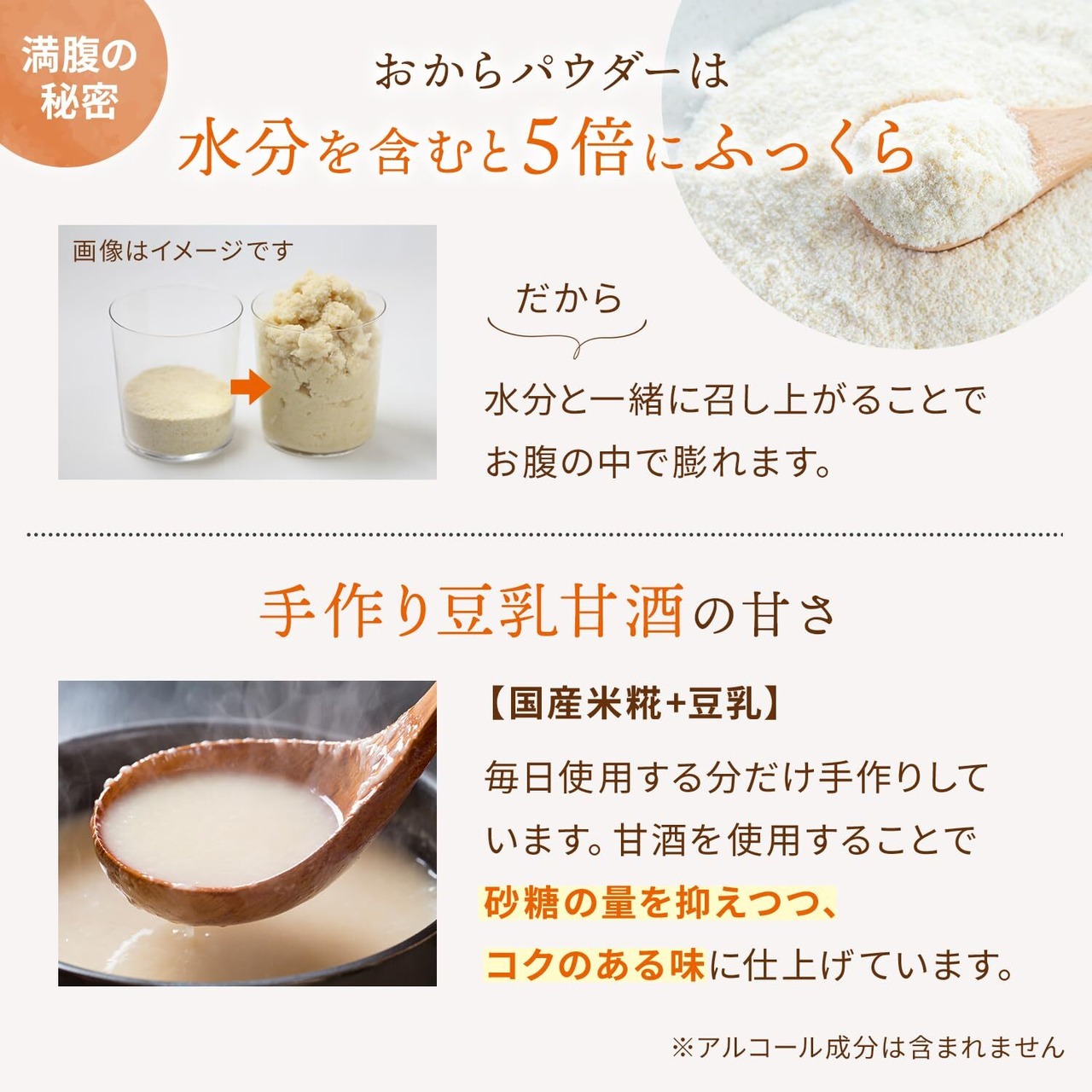 【豊富な食物繊維】一袋(2枚入)でレタス約1/2個分の食物繊維が含まれています。おなかの調子を整えて、体の内側からキレイをサポートします。また、おからパウダーは遺伝子組み換えでない大豆(non-GMO大豆)を原料に国内製造されたものを使用。安心してお召し上がりいただけます。