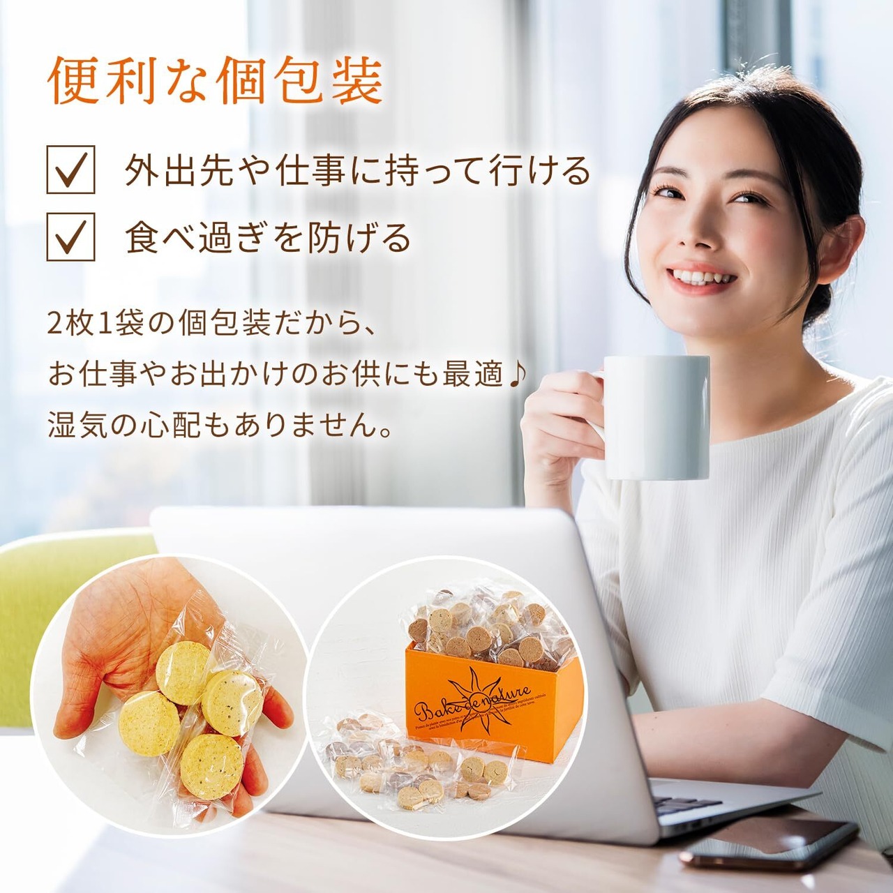 【便利な個包装】保存・保管・持ち運びやすさを考えた「2枚一組の個包装」。大袋ではないため、湿気の心配や面倒な入れ変えなども必要ありません。小さなカバンにも無理なく入れることができるため職場や外出時のお供にも。誕生日のプレゼントやギフトにもおすすめのダイエットクッキーです。