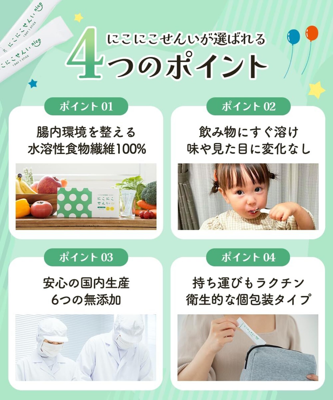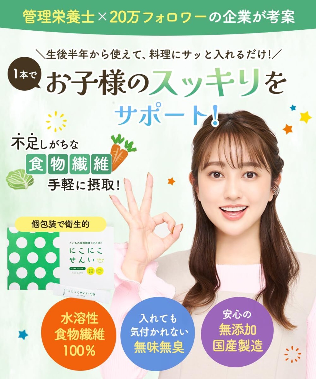 にこにこせんいは、気軽に食物繊維を摂取でき、個包装で衛生的な健康食品です。