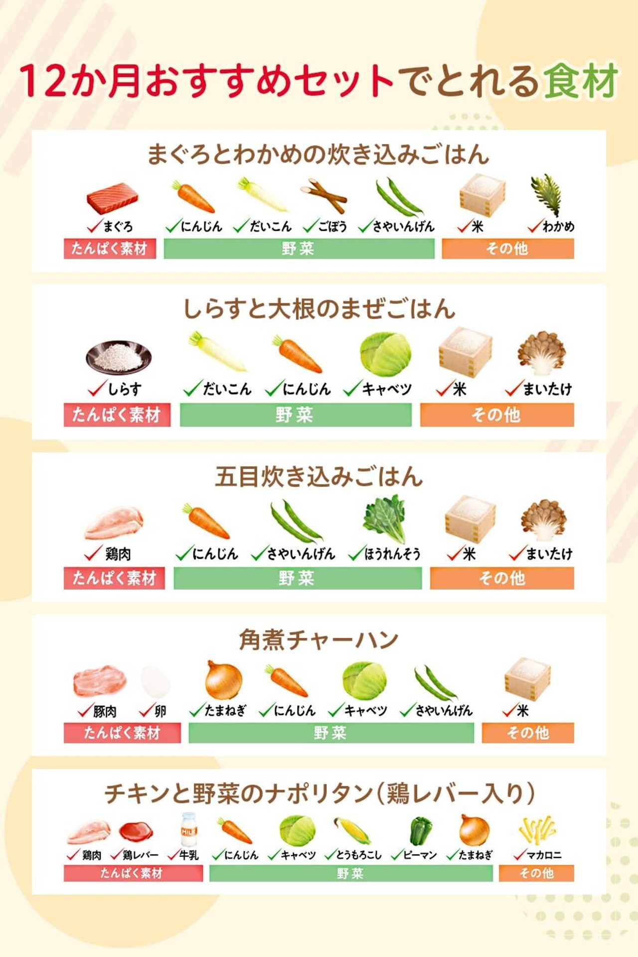 対象年齢:12ヶ月頃からの人気メニューをバランスよく取り揃えました、人気のメニューを中心にお肉・お魚など、お子さまに食べさせたいタンパク素材や味付けがバラエティに富んだ離乳食をセレクトしました。