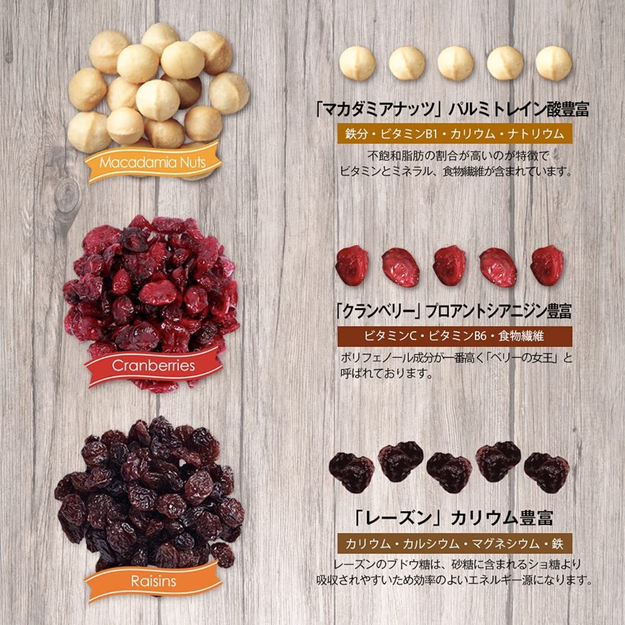 原材料名:アーモンド(アメリカ産)、くるみ(アメリカ産)、カシューナッツ(ベトナム産)、マカダミアナッツ(ケニア産)、レーズン(レーズン(アメリカ産)、植物油脂)、乾燥クランベリー(クランベリー(アメリカ産)、砂糖、植物油脂)