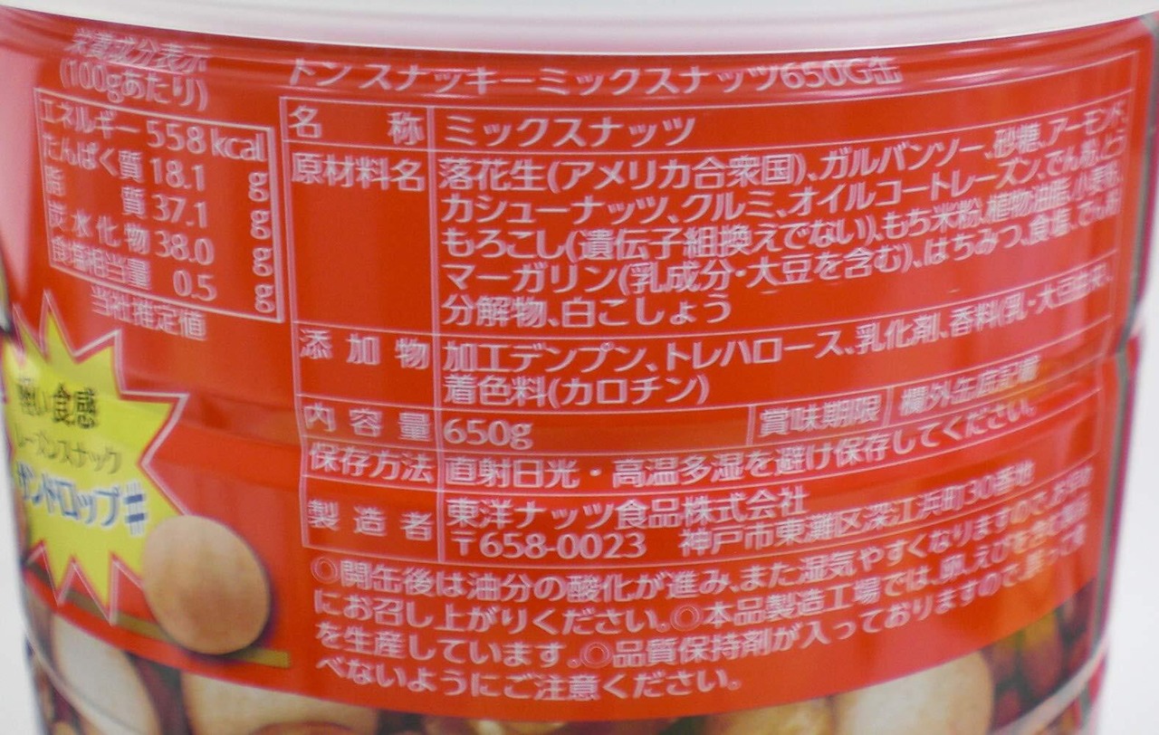 原材料名:落花生(アメリカ合衆国)、砂糖、ガルバンソー、アーモンド、カシューナッツ、クルミ、オイルコートレーズン、でん粉、ジャイアントコーン、もち米粉、植物油脂、小麦粉、はちみつ、食塩、マーガリン(乳成分・大豆を含む)、でん粉分解物、こしょう/添加物:加工デンプン、トレハロース、乳化剤、香料(乳由来)、着色料(カロチン)