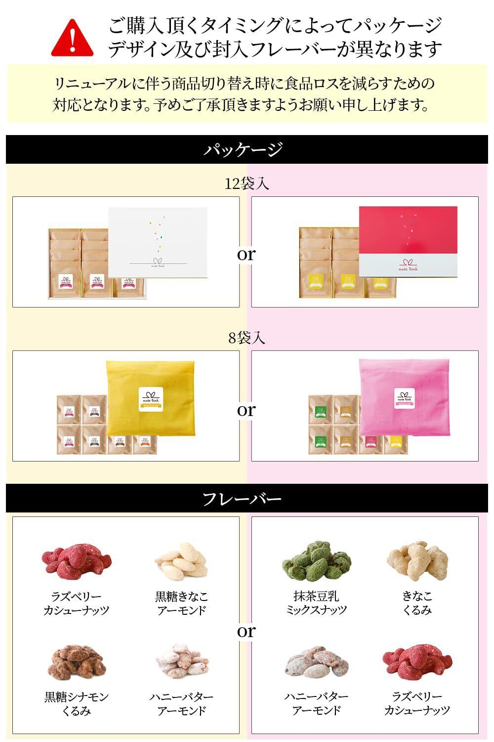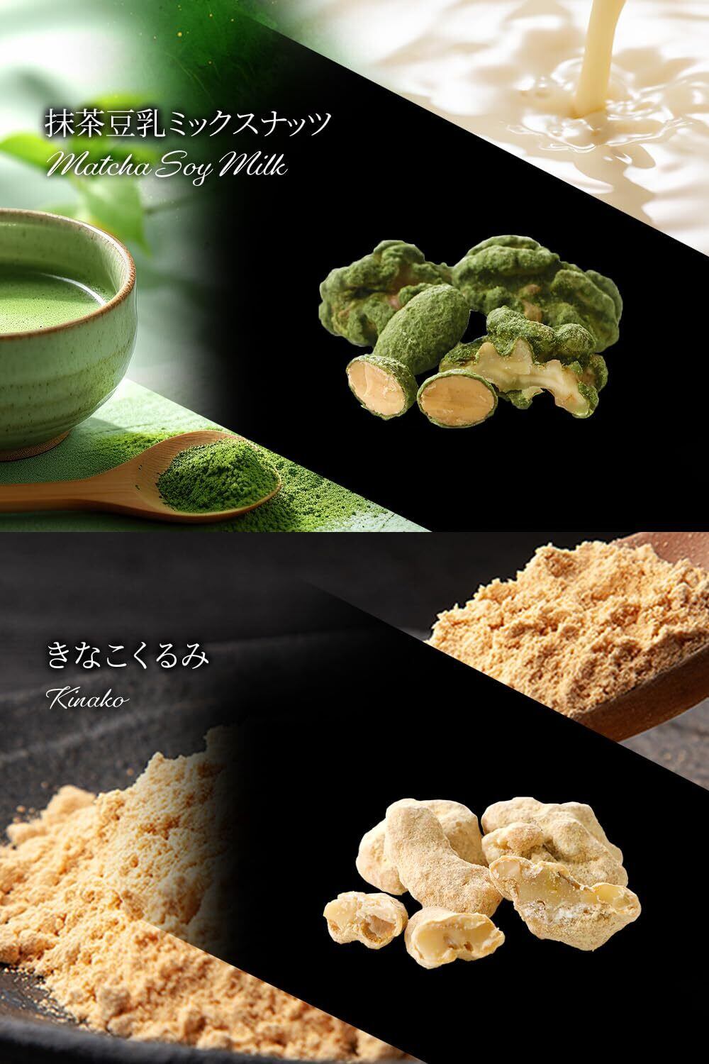 【こだわりのフレーバー2】[抹茶豆乳ミックスナッツ]:アーモンドとくるみに、京都産の宇治抹茶と、沖縄の黒糖で味に深みを出しました。さらにこだわりの国産大豆、濃度14%の「濃厚な豆乳」を加えて、和菓子にも似たまろやかな味わいに。[きなこくるみ]:丁寧に選別したくるみに、きなこをたっぷりまぶしてふわふわに仕上げました。北海道産大豆のきなこの美味しさを最大限に活かし、優しい甘さの三温糖で仕上げた和菓子のような逸品です。[ラズベリーカシューナッツ]:味が濃縮されたフリーズドライラズベリーとヨーグルトをたっぷりまぶしたフレーバーです。鮮やかな色合いと、甘味と酸味の絶妙なバランスが特に女性に大人気です。[ハニーバターアーモンド]:ハンガリー産アカシアはちみつとシーズニングをたっぷり重ね掛けし、香ばしいバター香る美味しさに仕上げました。やさしい甘さと奥深い味わいでファンが多いフレーバーです。