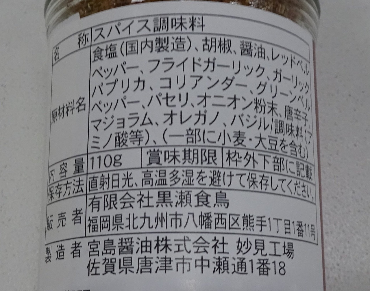 原材料:食塩、胡椒、醤油、レッドベルペッパー、フライドガーリック、パプリカ、コリアンダー、グリーンベルペッパー、パセリ、オニオン粉末、唐辛子、マジョラム、オレガノ、バジル、調味料(アミノ酸等)、(原材料の一部に大豆、小麦を含む)