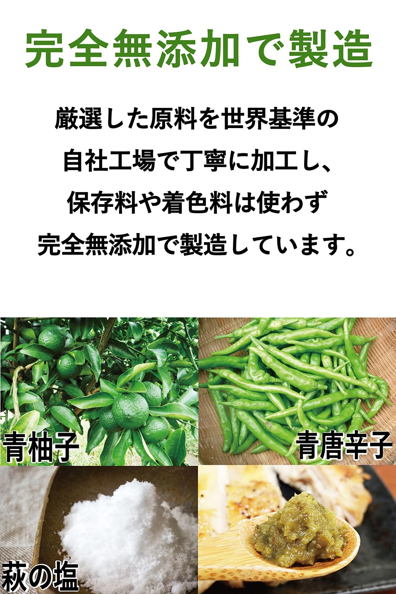 厳選した原料: 山口県の自然の中で豊かなに実った ゆず 、爽やかな香りとキレのある辛味が効いた 青唐辛子 、塩辛さの中にまろやかな旨味と丸みを持つ萩の塩を使い、国際規格FSSC認定工場で厳選した原料を丁寧に加工・製造しています。
