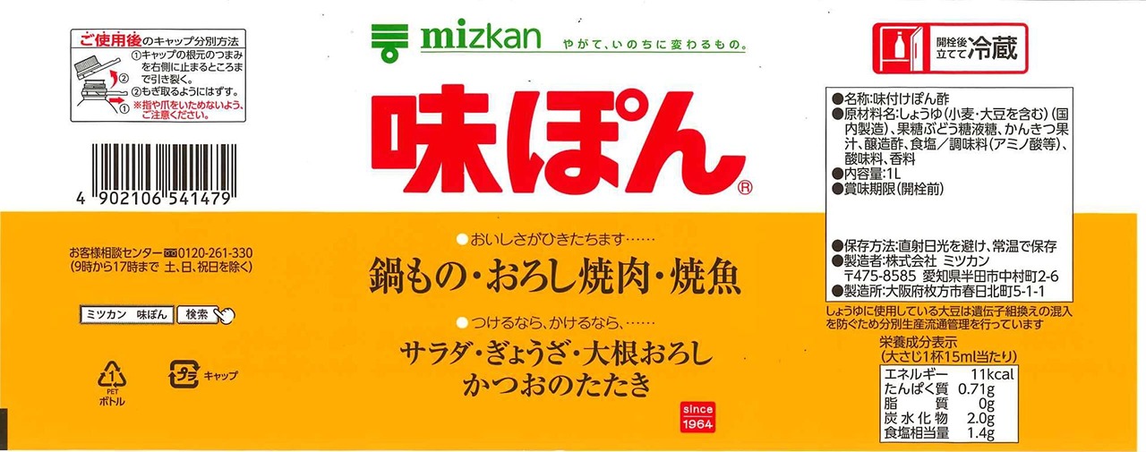 かんきつ果汁・醸造酢・しょうゆがひとつになった他では味わえない絶妙な風味の調味料です。鍋料理をはじめ、おろし焼肉・焼魚・ぎょうざ・冷奴など「つけて」「かけて」幅広くお使いいただける「ニッポンのさっぱり味」調味料です。味ぽんと水を1:1で鶏肉を煮込むだけで、簡単に「鶏のさっぱり煮」が作れます。 原材料・成分 しょうゆ(小麦・大豆を含む)(国内製造)、果糖ぶどう糖液糖、かんきつ果汁、醸造酢、食塩/調味料(アミノ酸等)、酸味料、香料