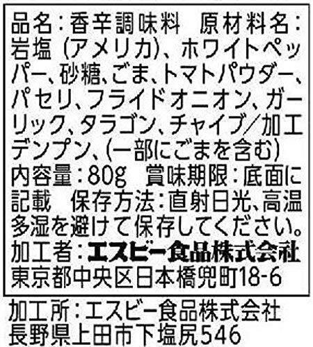 岩塩(アメリカ)、ホワイトペッパー、砂糖、ごま、トマトパウダー、パセリ、フライドオニオン、ガーリック、タラゴン、チャイブ/加工デンプン、(一部にごまを含む)
