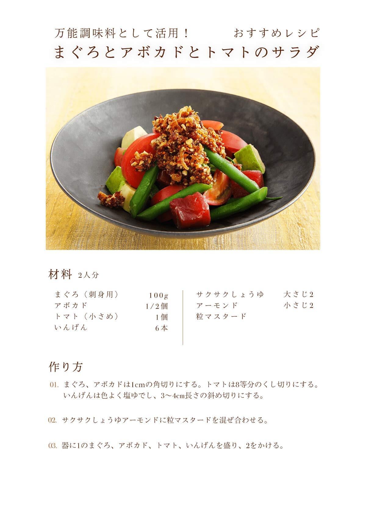 【パンのお供におススメ】納豆サンド:トーストした食パン(6枚切)を1/2に切り、包丁で切りこみを入れて間に大葉1 枚、梅干しひとつまみ、納豆(練らない)、サクサクしょうゆアーモンドを挟む。 のりトースト:トーストした食パンにバターをぬり、ちぎったのりとサクサクしょうゆアーモン ドをのせる。 はちみつフランスパン: フランスパンを切り、はちみつ、サクサクしょうゆアーモンドをのせる。