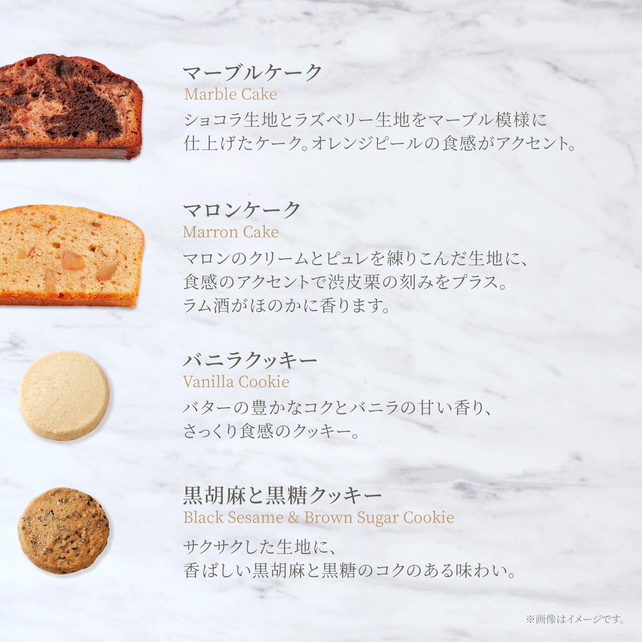 小麦粉、バター、卵など基本素材の持ち味を活かし焼き上げた、バームクーヘン、パウンドケーキなど人気の焼菓子をバラエティー豊かに詰合せました。