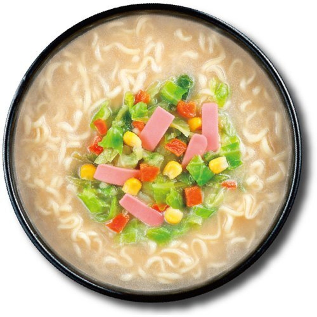 原材料:油揚げめん(小麦粉、植物油脂、でん粉、食塩、チキンエキス、大豆食物繊維)、スープ(ポークパウダー、食塩、粉糖、魚介エキスパウダー、デキストリン、植物油脂、野菜パウダー、粉末しょうゆ、コーンシロップ、香辛料、たん白加水分解物、ホエイパウダー、香味油、バターミルクパウダー)、かやく(キャベツ、カマボコ、コーン、ニンジン)、加工でん粉、調味料(アミノ酸等)、増粘剤(加工でん粉・タマリンド)、炭酸Ca、微粒二酸化ケイ素、香料、トレハロース、乳化剤、かんすい、カゼインナトリウム、クチナシ色素、pH調整剤、酸化防止剤(ビタミンE)、カラメル色素、紅麹色素、(原材料の一部に乳成分、えび、いかを含む)