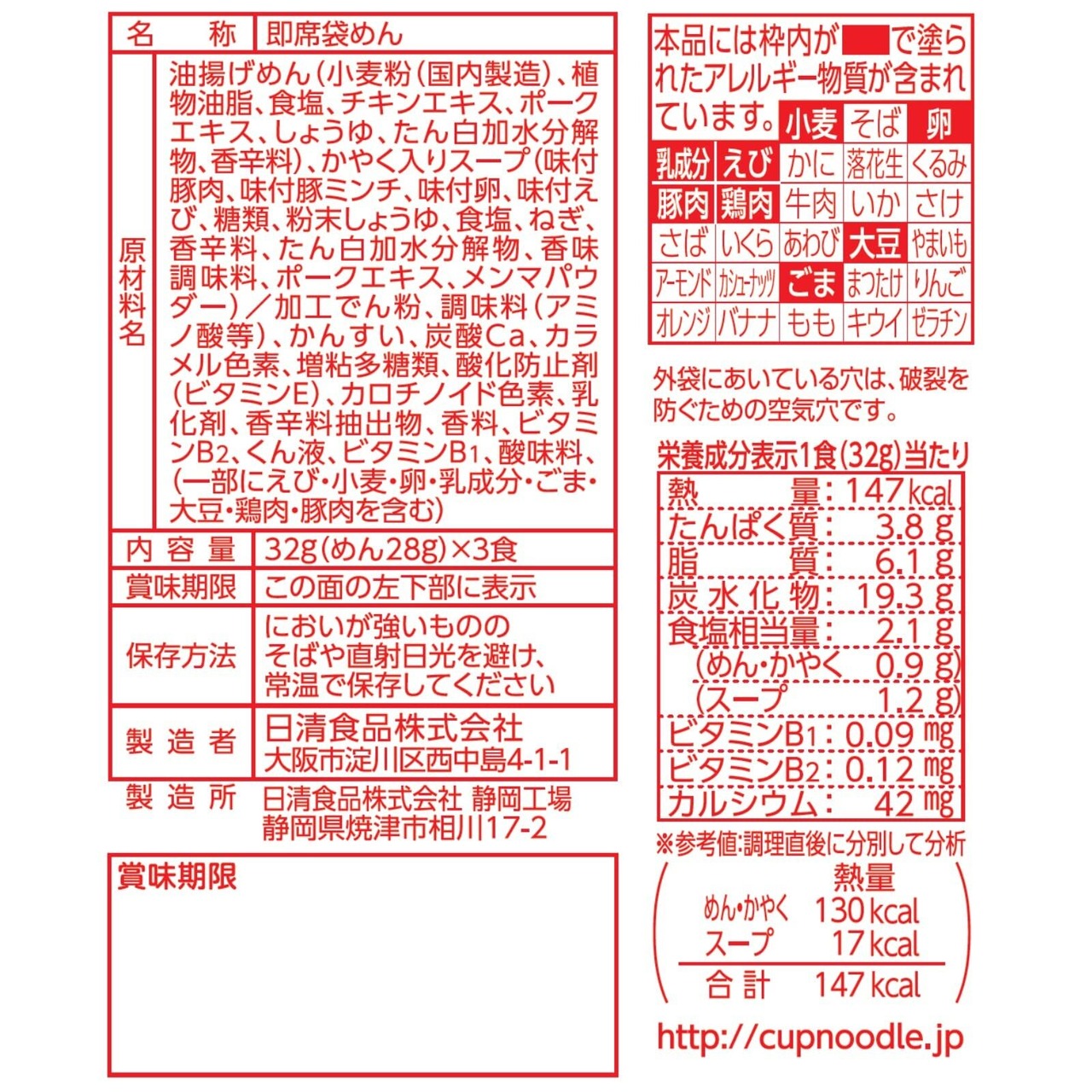 原材料:油揚げめん(小麦粉、植物油脂、食塩、チキンエキス、ポークエキス、しょうゆ、たん白加水分解物、香辛料)、かやく入りスープ(味付豚肉、味付豚ミンチ、味付卵、味付えび、糖類、粉末しょうゆ、食塩、ねぎ、香辛料、たん白加水分解物、香味調味料、ポークエキス、メンマパウダー)/加工でん粉、調味料(アミノ酸等)、炭酸Ca、かんすい、カラメル色素、増粘多糖類、カロチノイド色素、酸化防止剤(ビタミンE)、乳化剤、香辛料抽出物、香料、ビタミンB2、くん液、ビタミンB1、酸味料、(一部にえび・小麦・卵・乳成分・ごま・大豆・鶏肉・豚肉を含む)