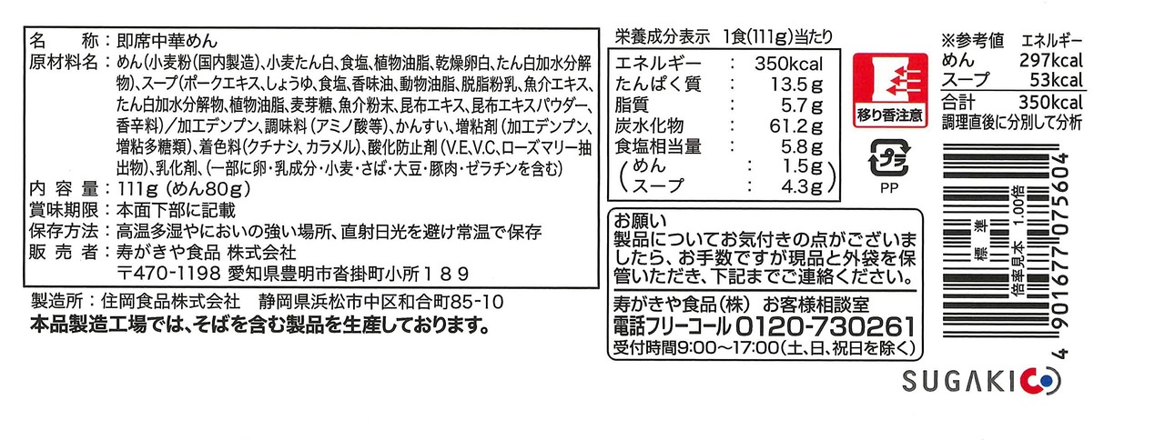 原材料:めん(小麦粉、小麦たん白、食塩、植物油脂、卵白、たん白加水分解物)、スープ(ポークエキス、しょうゆ、食塩、香味油、動植物油脂、脱脂粉乳、魚介エキス、たん白加水分解物、麦芽糖、魚介粉末、昆布エキス、昆布エキスパウダー、香辛料)、加工デンプン、調味料(アミノ酸等)、かんすい、増粘剤(加工デンプン、増粘多糖類)、着色料(クチナシ、カラメル)、酸化防止剤(V.E、V.C、ローズマリー抽出物)、乳化剤、(原材料の一部にさば、ゼラチンを含む)