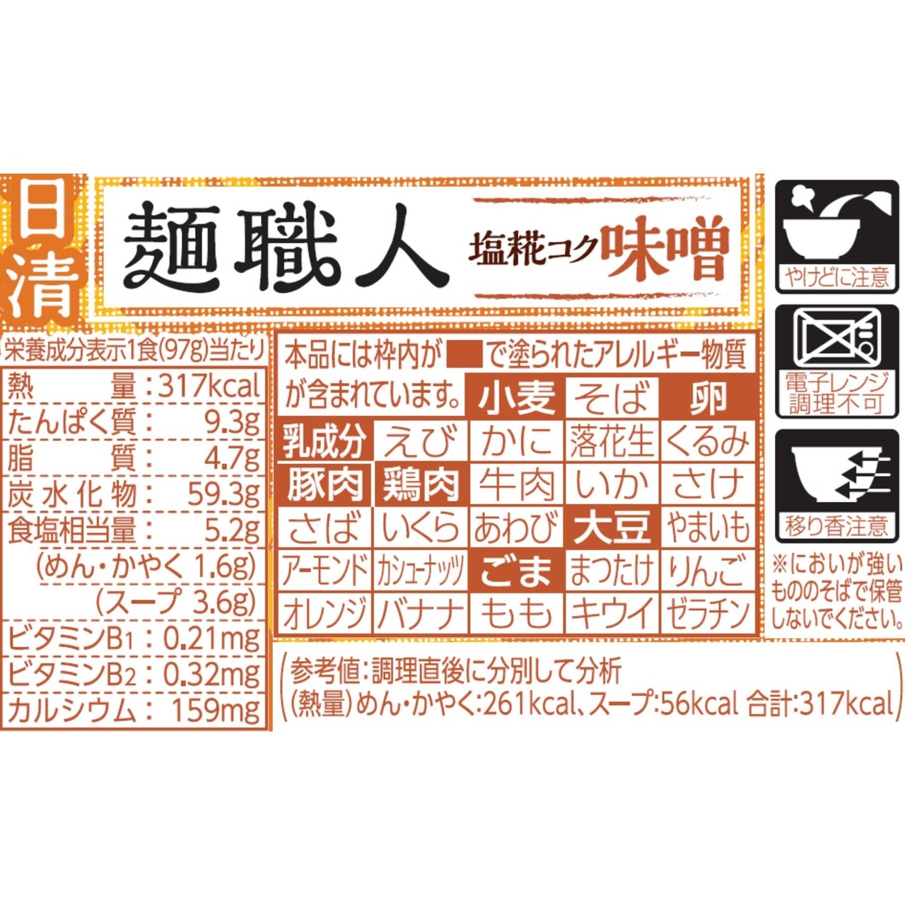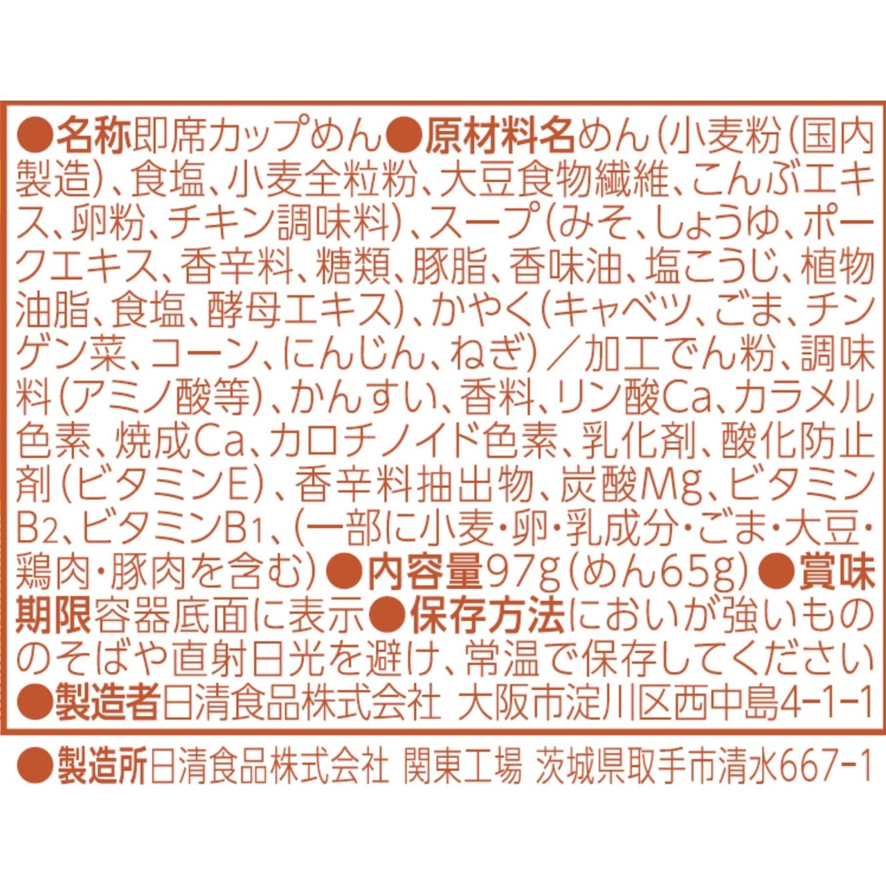 めん(小麦粉(国内製造)、食塩、小麦全粒粉、大豆食物繊維、こんぶエキス、卵粉、チキン調味料)、スープ(みそ、しょうゆ、ポークエキス、香辛料、糖類、豚脂、香味油、塩こうじ、植物油脂、食塩、酵母エキス)、かやく(キャベツ、ごま、チンゲン菜、コーン、にんじん、ねぎ)/加工でん粉、調味料(アミノ酸等)、かんすい、香料、リン酸Ca、カラメル色素、焼成Ca、カロチノイド色素、乳化剤、酸化防止剤(ビタミンE)、香辛料抽出物、炭酸Mg、ビタミンB2、ビタミンB1、(一部に小麦・卵・乳成分・ごま・大豆・鶏肉・豚肉を含む)
