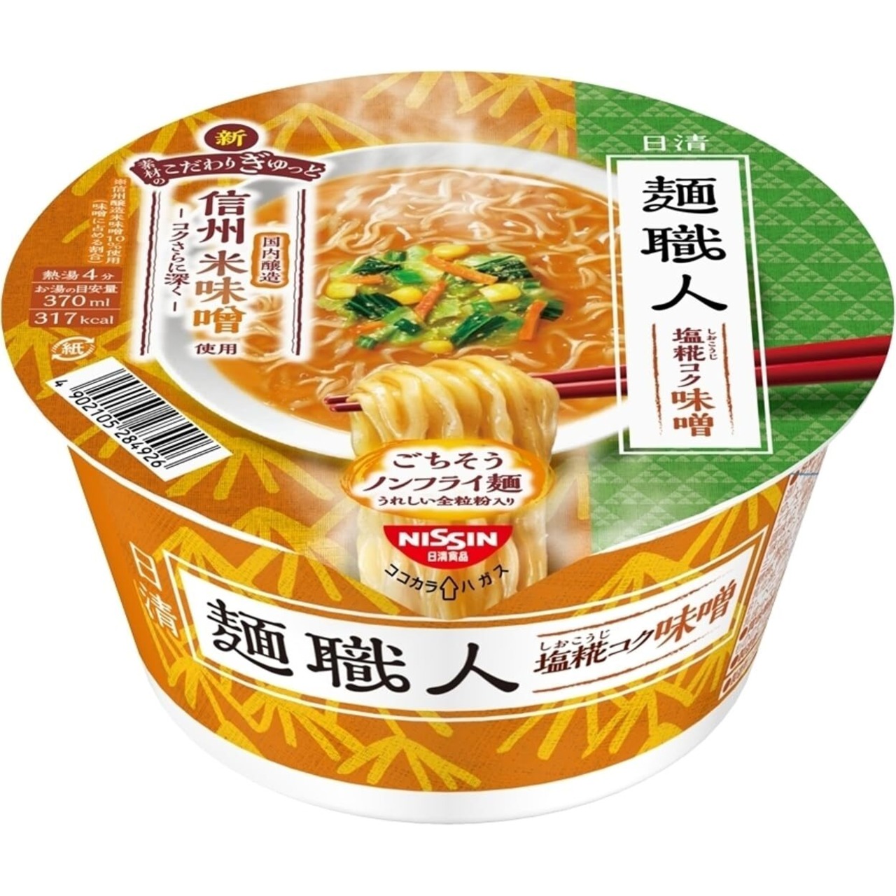 「日清麺職人」シリーズは、小麦の風味が感じられる全粒粉入りの「ごちそうノンフライ麺」が特長です。