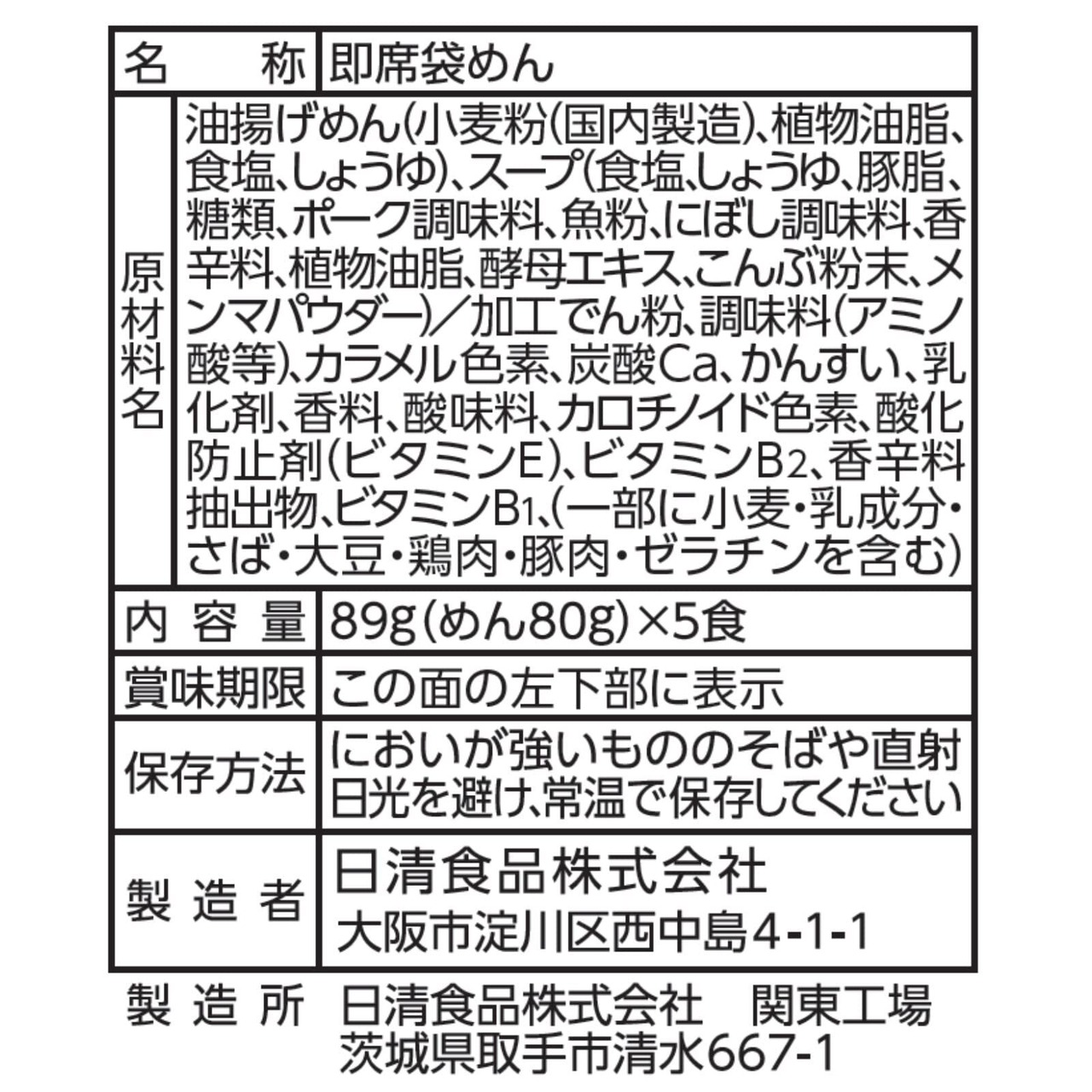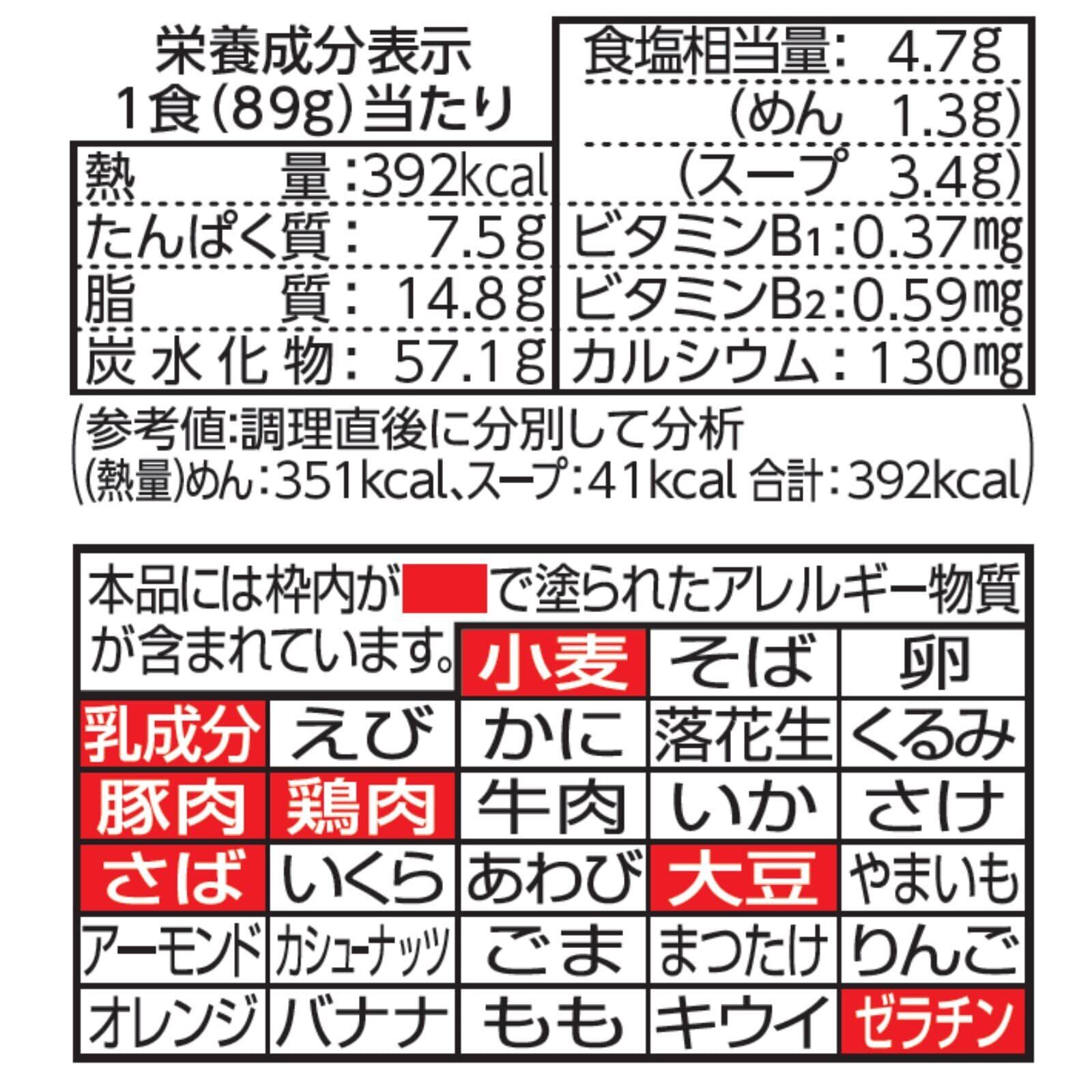 油揚げめん(小麦粉(国内製造)、植物油脂、食塩、しょうゆ)、スープ(食塩、しょうゆ、豚脂、糖類、ポーク調味料、魚粉、にぼし調味料、香辛料、植物油脂、酵母エキス、こんぶ粉末、メンマパウダー)/加工でん粉、調味料(アミノ酸等)、カラメル色素、炭酸Ca、かんすい、乳化剤、香料、酸味料、カロチノイド色素、酸化防止剤(ビタミンE)、ビタミンB2、香辛料抽出物、ビタミンB1、(一部に小麦・乳成分・さば・大豆・鶏肉・豚肉・ゼラチンを含む)