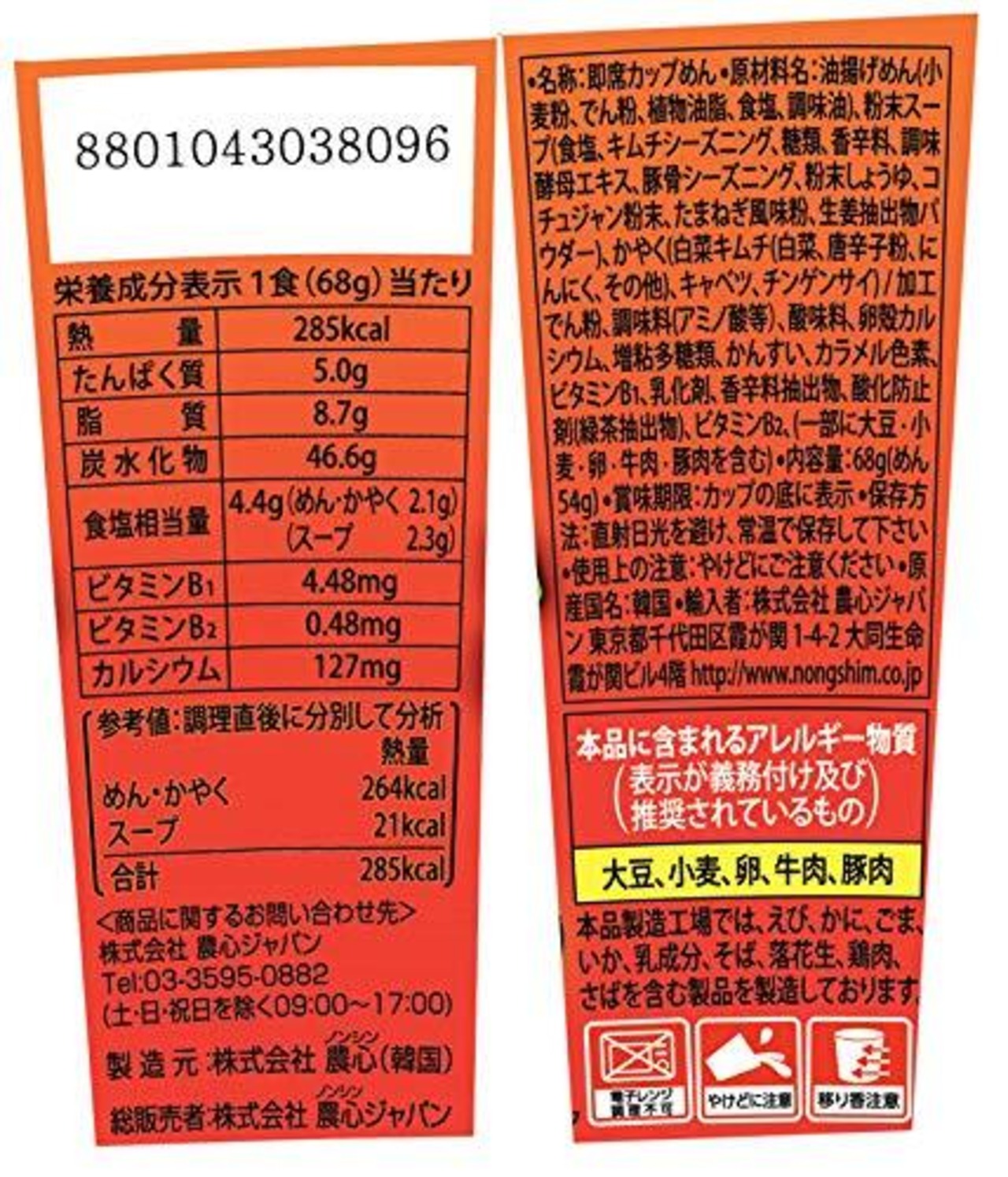 原材料名:油揚げめん(小麦粉、でん粉、植物油脂、食塩、調味油)、粉末スープ(食塩、キムチシーズニング、糖類、香辛料、調味酵母エキス、豚骨シーズニング、粉末しょうゆ、コチュジャン粉末、たまねぎ風味粉、生姜抽出物パウダー)、かやく(白菜キムチ(白菜、唐辛子粉、にんにく、その他)、キャベツ、チンゲンサイ) / 加工でん粉、調味料(アミノ酸等)、酸味料、卵殻カルシウム、増粘多糖類、かんすい、カラメル色素、ビタミンB1、乳化剤、香辛料抽出物、酸化防止剤(緑茶抽出物)、ビタミンB2、(一部に大豆・小麦・卵・牛肉・豚肉を含む)