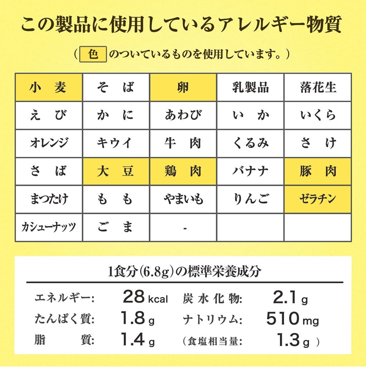 卵、小麦、大豆、鶏肉、豚肉、ゼラチン