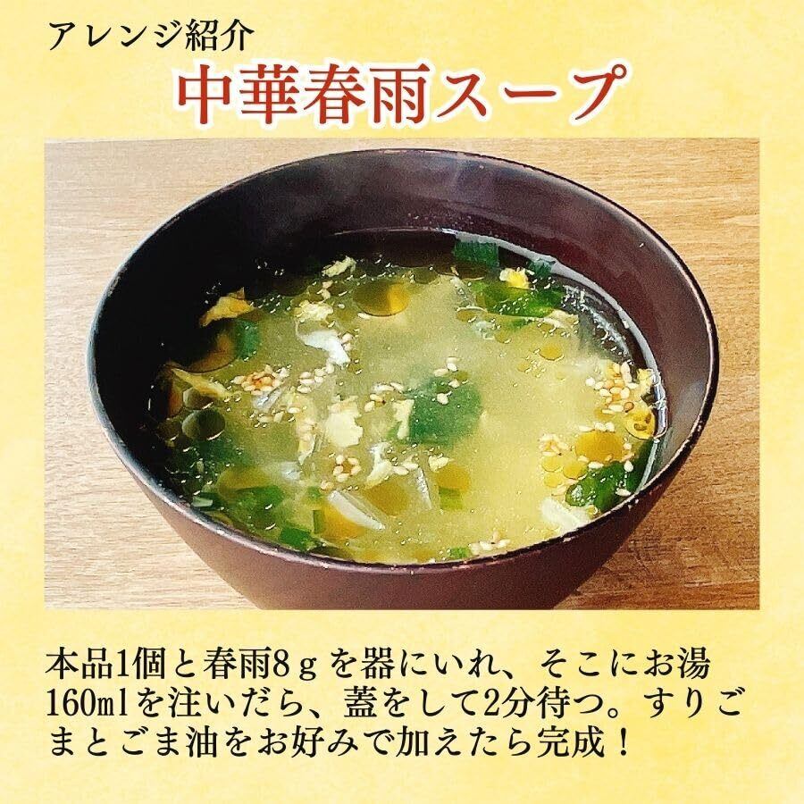 【原材料名】食塩、かつお節エキス、醤油、澱粉、デキストリン、かつお節粉末、昆布エキス、ゼラチン、香辛料、具(鶏卵(国産)、乾燥わかめ、乾燥ねぎ)/ソルビトール、調味料(アミノ酸等)、酸化防止剤(ビタミンE)、着色料(カロチノイド)、(一部に卵・小麦・大豆・ゼラチンを含む)