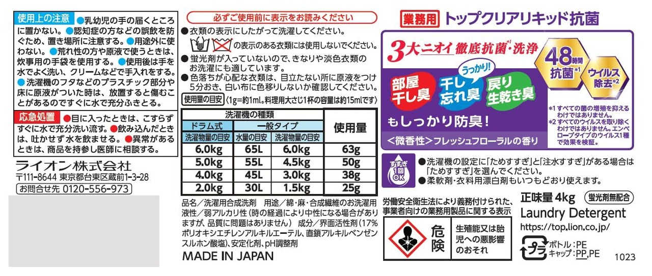 【業務用 大容量】 トップ クリアリキッド 抗菌 4kg 洗濯洗剤 詰め替え 蛍光剤無配合 部屋干し 洗剤 液体