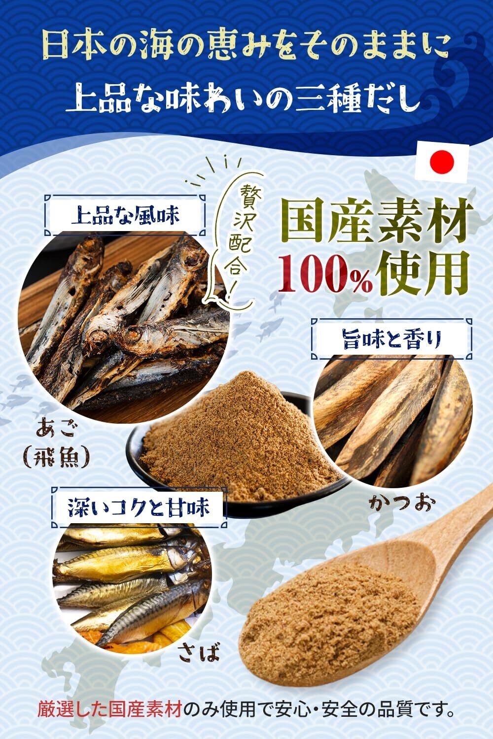 【国産天然素材】あご(上品な旨味)、かつお(旨味と香り) さば(深いコクと甘味)の三種だしです。
