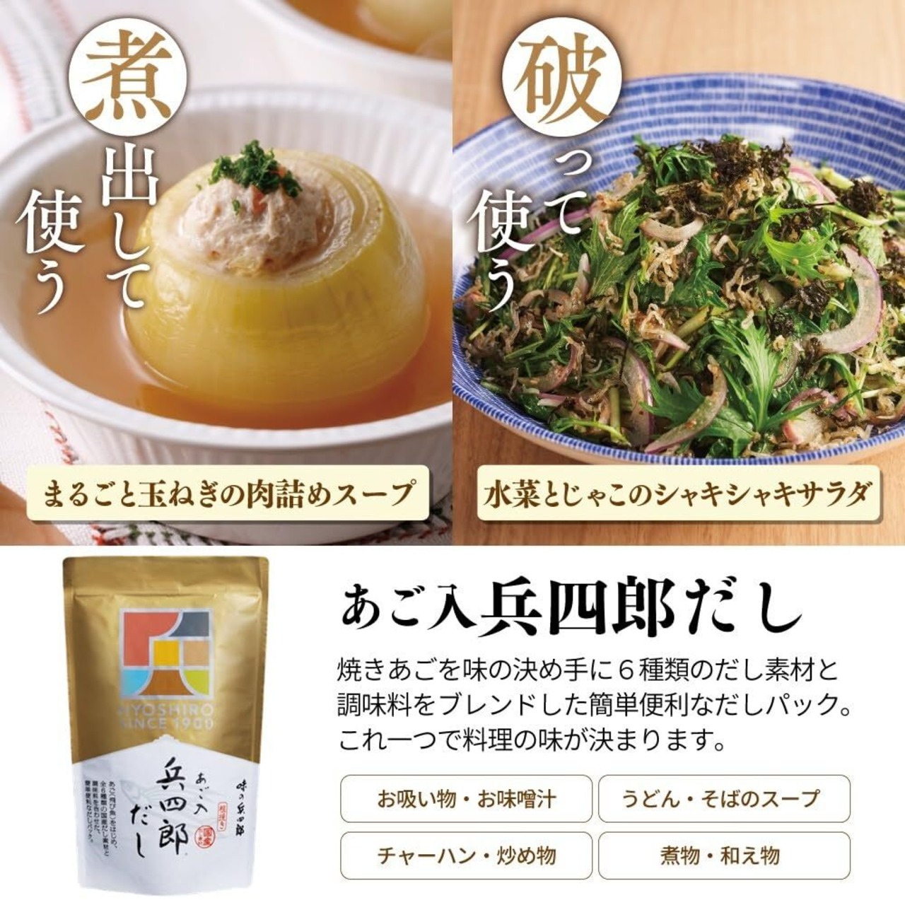 長崎県平戸産の焼きあごをはじめとする6種類の国産だし素材に、塩や醤油を加え味を調えたあごの旨み豊かなだしパック