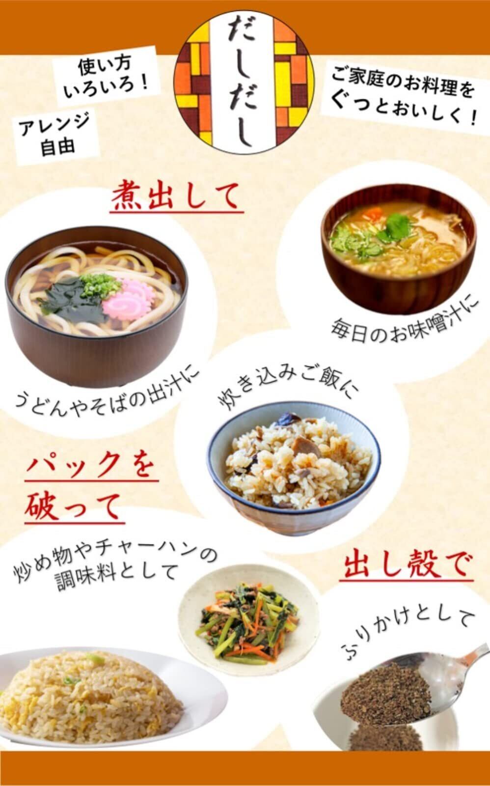 【使い方いろいろ万能だし】煮だして使用する他、だしパックを破って入れるだけで炊き込みご飯や炒め物、パスタやふりかけなど和食だけでなく、洋風、中華風など使い方様々。