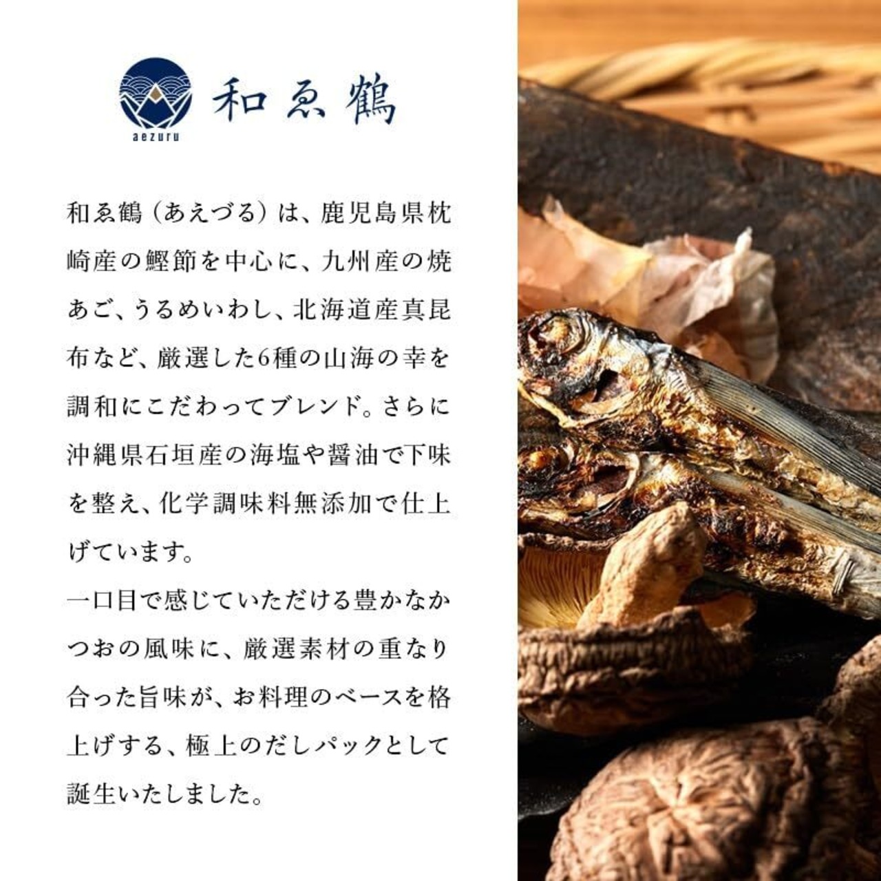 【ご家庭で、簡単・手軽に本格出汁のだしパック】 「和える」それは単体以上の良さを生み出すこと。選び抜いた素材が調和した「和え鶴」は、料理をより美味しくより感動的なものへと仕上げます。かつお節にうるめいわし節、煮干し、焼きあご、昆布、椎茸と、厳選した原料を使用した風味豊かな“重ねだし”のだしパックです。塩や醤油で味を調えておりますので、どんなお料理とも調和する、上質な出汁が手軽にとれます。