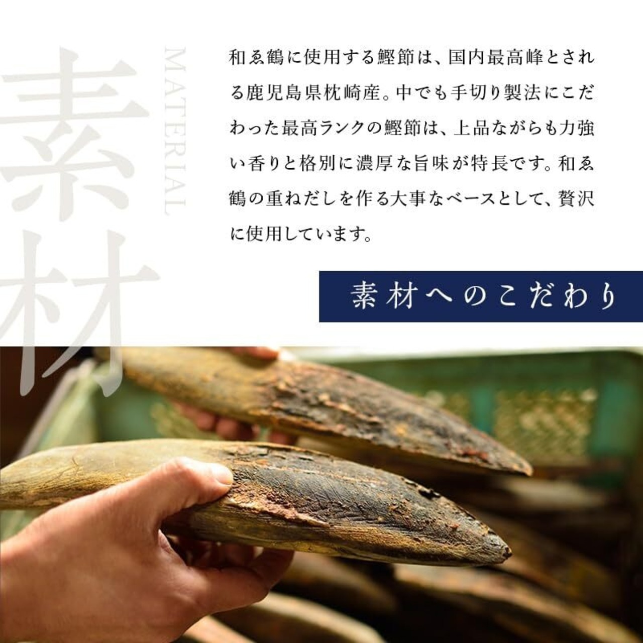 【日本中から厳選した素材】 鹿児島県枕崎産のかつお節を筆頭に、焼きあご、真昆布、椎茸など、和え鶴だけの調和のとれた味を求め、国内中から厳選した素材を贅沢に使用しています。